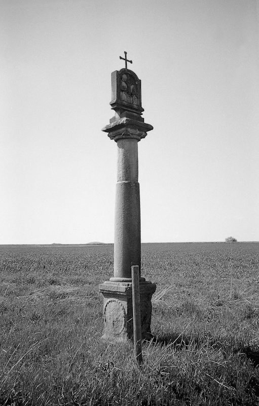 Leicht von der Straße zurück versetzter barocker Bildstock, der vermutlich aus dem 1. Viertel des 18. Jahrhunderts stammt. Die Seitenflächen des kleinen Postaments sind durch hochovale Zierfelder mit strickartiger Rahmung verziert. Die darin befindlichen Inschriften sind nicht mehr lesbar. Die kräftige, im oberen Drittel abgesetzte Säule mündet in ein flaches profiliertes plattenartiges Kapitell. Sie trägt den Aufsatz mit eingerücktem Segmentbogenabschluss und bekrönendem Eisenkreuz. Das Bildfeld auf der Vorderseite zeigt das Relief einer Kreuzigungsszene. Der Aufsatz stellt laut Inschrift auf der Rückseite eine Nachbildung aus dem Jahre 1989 dar.