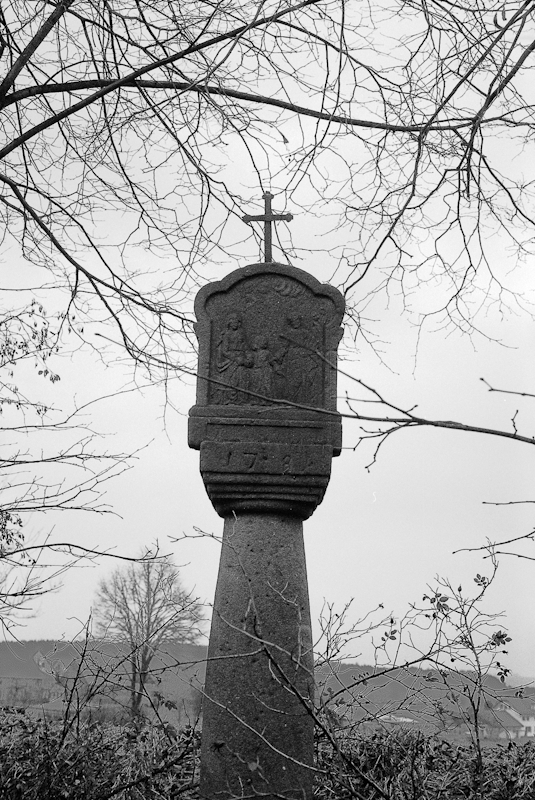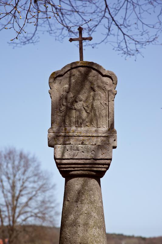 Auf einem Grünstreifen zwischen der Straße nach Steinbach und der Feldflur gegenüber der Steinbacher Straße 20 aufgestellter Bildstock, bezeichnet 1781. Über einer quadratischen Bodenplatte erhebt sich das schlanke Postament, dessen Seiten mit Zierfeldern versehen sind. Die stark geschwellte Säule mit flachem profiliertem Würfelkapitell trägt den schlanken, seitlich verzierten Segmentbogenaufsatz. Im Bildfeld vorne ist die hl. Familie mit Heilig - Geist - Taube dargestellt, auf der Rückseite ist der kreuztragende Christus zu sehen.
