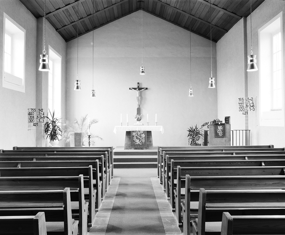 Die am Ortsrand in Richtung Leibolz stehende evangelische Kreuzkirche ist ein schlichter massiver Rechteckbau aus dem Jahre 1955. Markantestes Bauglied ist der an einer Längsseite leicht eingestellte querrechteckige 18 Meter hohe Glockenturm mit Rundbogenportal und Pultdach. Auf diesem Dach ragt ein Stahlkreuz aus Doppel - T - Trägern empor. Die Kirche ist Teil des von dem Bad Hersfelder Architekten Gundermann geplanten evangelischen Gemeindezentrums Eiterfeld, zu dem zusätzlich Gemeinde- und Jugendräume innerhalb des Kirchengebäudes sowie das 1956 erbaute Pfarrhaus gehören. Die verputzten Fassaden der Kirche werden lediglich durch unterschiedlich große Sprossenfenster akzentuiert. Fenstermaße und -anordnung geben, vor allem auf der Eingangsseite (Turmseite) die innere Raumverteilung wieder. Ein großes, fast vom Boden bis zur Traufe reichendes Rechteckfenster nahe der ungegliederten hinteren Giebelseite gibt der Altarzone ausreichend Licht. Die zwei folgenden, unter der Traufe angeordneten Rechteckfenster belichten das Kirchenschiff. Hinter dem Turm ruht das schleppdachartig heruntergezogene Dach auf der Außenwand des Vorraums; kleine Rechteckfenster sorgen hier für Licht. Die zur Straße weisende Giebelseite besitzt ein großes Rundfenster, während die folgende Längswand drei Achsen hochrechteckiger Fenster aufweist. Der Innenraum ist als schlichte Halle mit an die Form des Satteldaches angepasster Holzdecke ausgebildet, wobei Schiff und Altarraum eine ungetrennte Einheit bilden. Drei Sandsteinstufen führen zu Altar, Taufstein und Kanzel. Letztere ist dabei als Ambo über die Stufen in den Kirchenraum hinein gezogen und verdeutlicht somit die Nähe des Pfarrers zu seiner Gemeinde. Über dem Altar befindet sich ein barockes Kruzifix. Unter der Empore wurde der durch Falttüren abgeteilte Gemeinderaum eingerichtet, der im Bedarfsfall zum Kirchenraum hinzu genommen werden kann. Im Untergschoss der Kirche sind die Räume für die Jugend- und Gemeindearbeit untergebracht. Das Gebäude ist ein interessantes Beispiel für die vor allem nach 1945 populäre Bauaufgabe "Gemeindezentrum"; die Kirche selbst kann als schlichtes, aber illustratives Exempel für den ländlichen Sakralbau der 1950er Jahre gelten.