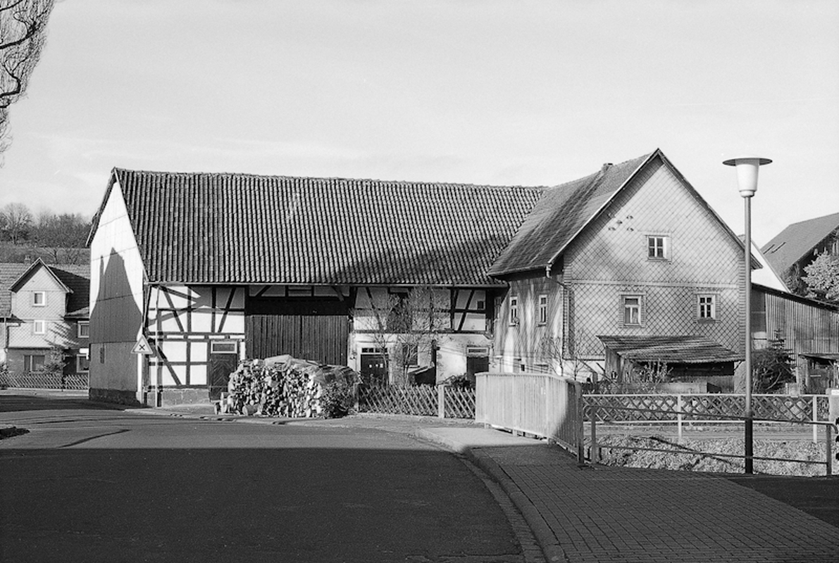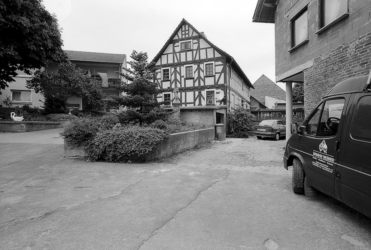Nahe der platzartigen Erweiterung in der Ortsmitte stehendes Fachwerkhaus. Das zweistöckige Gebäude weist eine klare regelmäßige Konstruktion aus der Zeit um 1800 auf. Mannfiguren dienen zur Verstrebung der Bund- und Eckständer. An der linken Giebelseite werden die zwei Bundbalken, die die Längsunterzüge tragen durch Fischgrät - Fachwerk gestützt.