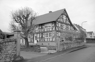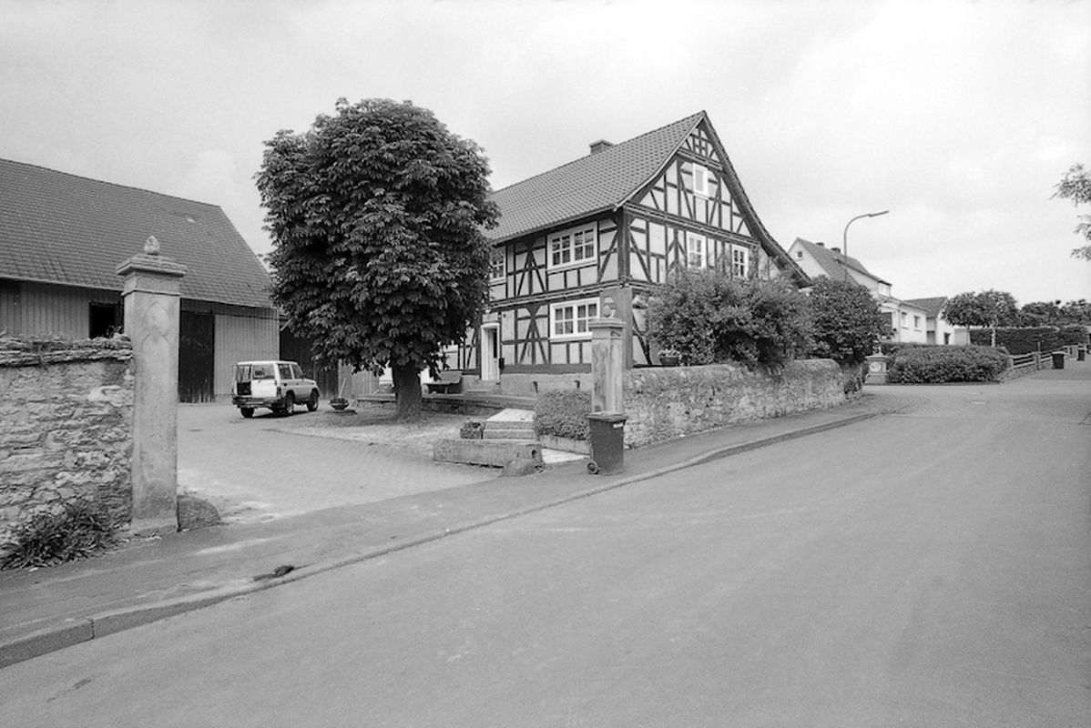 Am östlichen Ortsrand stehendes stattliches zweistöckiges Fachwerkhaus auf mittelhohem Quadersockel. Das dreizonige Gebäude weist eine qualitätvolle regelmäßige Figuration aus der Zeit um 1800 auf. Mannfiguren dienen zur Aussteifung der Eck- und Bundständer. Auf der zur Straße weisenden Giebelseite werden die zwei Längsunterzüge der Konstruktion durch Fischgrät - Fachwerk abgestützt. Die Gebälkzone ist in zeittypischer Manier mit profilierten Schwellbalken, gerundeten Füllhölzern und Balkenköpfen gestaltet. Der usrprünglich an die hintere Giebelseite anschließende Stall- und Tennenteil des Hauses wurde kürzlich abgerissen. An die hintere Längsseite wurde eine jüngere Wohnhauserweiterung in angepasstem Fachwerk schleppdachartig eingebunden.