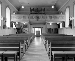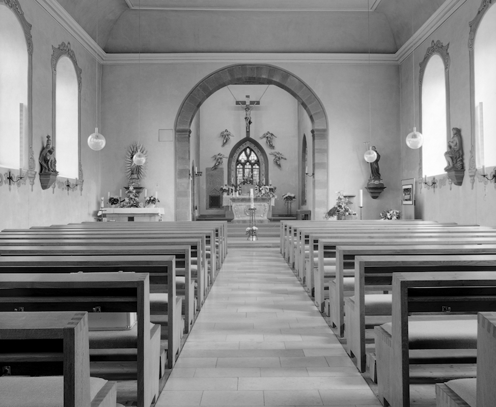 Der Innenraum präsentiert sich als Saal mit Spiegeldecke. Schiff und Chorraum werden durch einen runden Chorbogen getrennt. der Altarraum selbst hat eine Holzdecke mit Rankenmalerei. Die Sakristeitür zeigt ein gotisches Gewände mit Rundstab, der am Fuß schraubenförmig gedreht ist sowie doppelte Kehlung. In der Ostwand sitzt eine spätgotische Sakramentsnische mit Kielbogen, Fischblasen und Maßwerkblenden, bei der alle plastisch hervortretenden Teile abgeschlagen sind. Darüber ist eine Inschrift mit Jahreszahl zu lesen: "Anno dni mccclxxxvi" (1486). Die ursprüngliche Ausstattung der Kirche ist mehrfach verändert worden, wobei zahlreiche Skulpturen noch aus der Barockkzeit stammen. Die katholische Kirche St. Antonius der Einsiedler ist ein seltenes Beispiel klassizistischer ländlicher Sakralarchitektur im Kreisgebiet. Sie steht im Ortskern an straßenräumlich markanter Stelle an der Kreuzung St. Antoniusstraße / Melmstraße / Linkbergstraße.