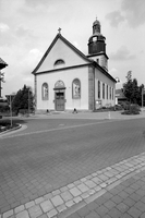Die katholische Kirche St. Antonius der Einsiedler wurde in den Jahren 1838-42 in klassizistischen Formen errichtet. Der verputzte Rechteckbau des Schiffes ist durch eine schlichte Fassadengestaltung charakterisiert. Auf einem niedrigen Quadersockel erhebt sich der durch Ecklisenen und Dachgesimse gefasste Baukörper. Die Längsseiten weisen je fünf Achsen Rundbogenfenster mit einfachen Rahmungen auf. Die Eingangsseite zeigt ein schlicht gefasstes Rechteckportal mit rundbogigem Giebelfeld, in das ein Dreifaltigkeitsrelief eingelassen ist. In den seitlichen Rundbogennischen befinden sich Sandsteinfiguren der hl Petrus und Paulus. Die Arbeiten des fränkischen Bildhauers Heinrich Schiestl stammen aus der Erbauungszeit des Schiffes. In der Achse über dem Portal sitzt im Giebel ein Halbrundfenster, der Dachfirst wird von einem kleinen Sandsteinkreuz bekrönt. Die unteren steinernen Geschosse des an der Ostseite einspringende Chorturms mit ihrer unregelmäßg versetzten Eckquaderung stammen von einem mittelalterlichen Vorgängerbau. In der Ostwand des Turmes sitzt ein dreiteiliges spätgotisches Spitzbogenfenster mit Dreipässen und Fischblasen, an der Nord- bzw. Südseite befindet sich je ein einfaches Spitzbogenfenster. Das oberhalb eines Geschossgesimse sitzende steinerne Obergeschoss des Turmes mit regelmäßig versetzter Eckquaderung wurde wie das darüber liegende achtseitige verschieferte Fachwerkgeschoss mit geschweifter Kuppel und geschlossener Laterne im Jahre 1840 aufgestockt.
