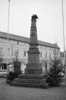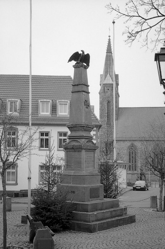 Im nördlichen Teil des Stadtkerns auf der platzartigen Erweiterung "Am Anger" aufgestelltes Denkmal, bezeichnet 1912. Über einer mehrfach abgestuften Basis aus Sandsteinquadern, die der letzten Instandsetzung zu verdanken ist, sitzt das eigentliche historische Postament. Auf seinen Flächen finden sich gerahmte Felder mit Inschriften, die als Stiftungsgrund das Andenken an die Gefallenen des Deutsch - Französischen Krieges von 1870/71 aus dem Kreis Hünfeld, deren Namen sowie das Entstehungsjahr und den Stifter Freiherr Wilhelm von Kleydorff nennen. Den oberen Abschluss des Postamentes bildet eine mit Zahnschnitt, Muschelrelief, Wulst und Kehle, akanthusartigem Blattwerk sowie gerahmtem diamantiertem Band verzierte Zone, auf der ein konisch zulaufender Pfeiler sitzt. Dieser, etwas oberhalb der Mitte durch zwei umlaufende Profilbänder strukturierte Pfeiler trägt über einer profilierten Platte einen Bronzeadler mit geöffneten Schwingen. Auf der Vorderseite ist im unteren Bereich des Pfeilers ein eisernes Kreuz appliziert. Das Denkmal, das früher an einer etwas anderen Stelle stand und später jahrelang im städtischen Bauhof lagerte, wurde im Jahre 1984 neu aufgerichtet und in die neue Platzgestaltung des Anger integriert. Im Zuge der Neuerrichtung am Sockel angebrachte schlichte Jahreszahlen (1914-18 sowie 1939-45) erinnern die späteren Kriege. Auf einer Bronzetafel wird der umfassendere Grund für die Wiederaufstellung erläutert: "EHRENMAL für die Gefallenen des Krieges 1870-71 / Wiedererrichtet im Jahre 1984 im zweiten Jahrzehnt der Verschwisterung der Städte Hünfeld und Landerneau / Zur ERINNERUNG an die Gefallenen und Toten der Kriege / Zur MAHNUNG an die verheerenden Folgen einstiger Feindschaft / Zum Zeichen der FREUNDSCHAFT zwischen dem deutschen und dem französischen Volk / In der Hoffnung auf einen dauerhaften Frieden in Europa".