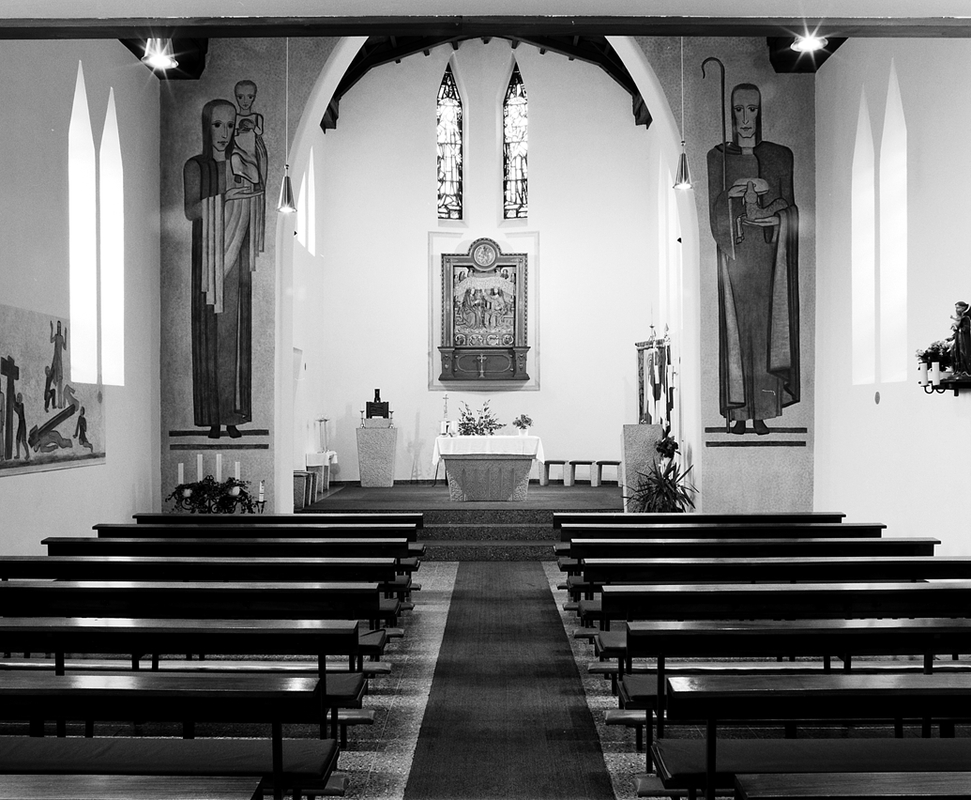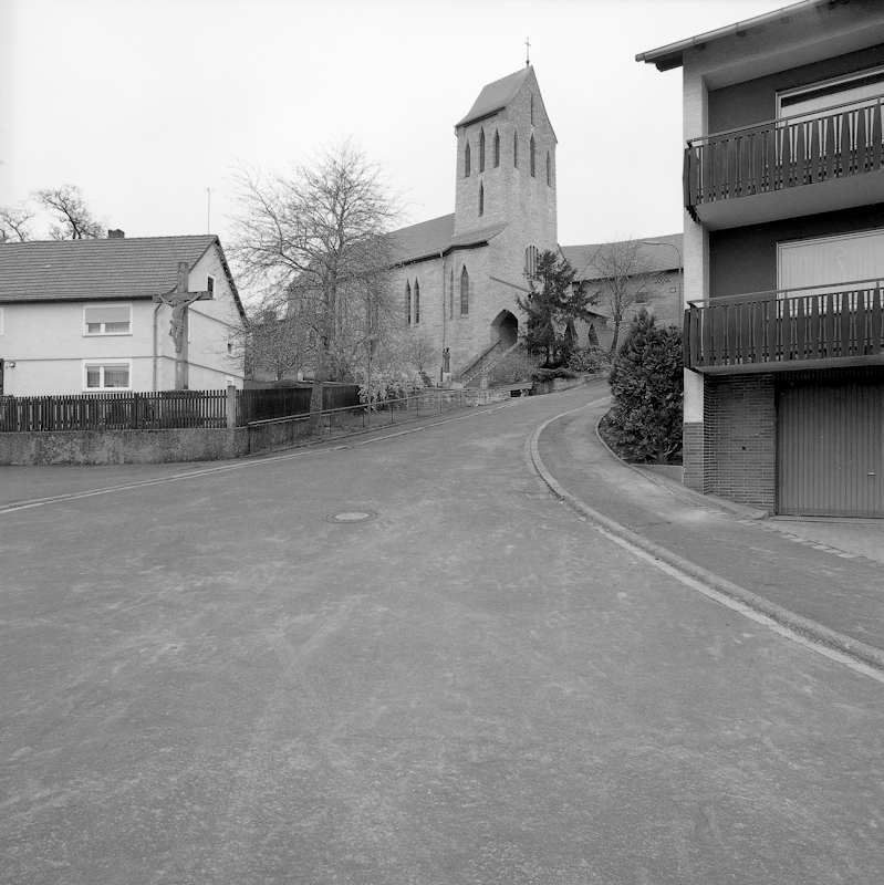 Die katholische Kirche St. Antonius von Padua wurde in den Jahren 1929-31 nach den Plänen des Darmstädter Architekten Johann Baptist Becker am Hang zwischen Rhönstraße und Spessartstraße errichtet. Das in einheimischem Kalk - Bruchstein erstellte Gebäude erhebt sich über einem rechteckigen Grundriss; es hat einen einspringenden zweiseitig geschlossenen Chor und einen Frontturm. Der Eingang wird durch eine Vorhalle überbaut. Hervorstechendstes Merkmal der Fassadengestaltung ist die Anordnung der schlanken, oben spitz zulaufenden Wandöffnungen, die beim Schiff paarweise als Fenster, beim Turm als je drei einzelne Schallöffnungen pro Seite ausgeführt sind. Die Zugänge zur Vorhalle sind spitzbogig gestaltet. In der Turmwand über der Vorhalle sitzt ein großes vertikal gegliedertes Rundfenster, ein Motiv, dass auch bei Dominikus Böhm und anderen zeitgleichen Architekten in Erinnerung an mittelalterliche Westrosen Anwendung fand. Der Innenraum der Kirche weist eine gebrochene Holzdecke sowie einen parabelförmigen Chorbogen auf. Im Chor befinden sich Antikglasfenster mit der Darstellung des Patronatsheiligen sowie der hl. Theresia vom Kind Jesu, die, wie auch die verschieden farbige Ornamentverglasung aus der Paderborner Werkstatt Peters stammen. Die Ausmalung der Kirche schuf Else Birks, Düsseldorf. Auf der Chorbogenwand sind die überlebensgroßen Darstellungen des Guten Hirten und der Gottesmutter, an den Seitenwänden Kreuzwegszenen zu sehen, von denen die Kreuzigung (12. Station) durch ihre Größe hervor gehoben ist. Auf den Emporenpfeilern sind noch Johannes d. T., Moses am Felsen sowie Petrus und Paulus dargestellt. Bemerkenswert ist, dass sich durch die farbige und motivische Fensterverglasung sowie das Ausmalprogramm eine einheitliche Raumfassung aus der Erbauungszeit der Kirche erhalten hat, ein seltener und umso bedeutenderer Fall. Das architektonische Erscheinungsbild der Kirche orientiert sich an der seinerzeit modernen Stilsprache des sogenannten Expressionismus und bildet mit der farbigen Ausgestaltung ein Gesamtkunstwerk, wie es von zeitgenössischen Architekten angestrebt wurde. Daneben birgt die Kirche auch ein wichtiges älteres Ausstattungsstück, eine Altarretabel, die vermutlich aus der Fuldaer Stifstkirche stammt. Ein rechteckiger Rahmen mit Renaissance - Ornamenten und dem Wappen des Fuldaer Fürstabtes Joachim von Gravenegg (1644-71) umschließt ein spätgotisches Relief der Krönung Mariens durch Christus als Himmelskönig. Die katholische Kirche St. Antonius von Padua ist ein für die Entstehungszeit und das dörfliche Umfeld selten moderner Sakralbau, der sein einheitliches Bau- und Raumprogramm bewahrt hat und durch seine exponierte Lage die örtliche Umgebung dominiert.