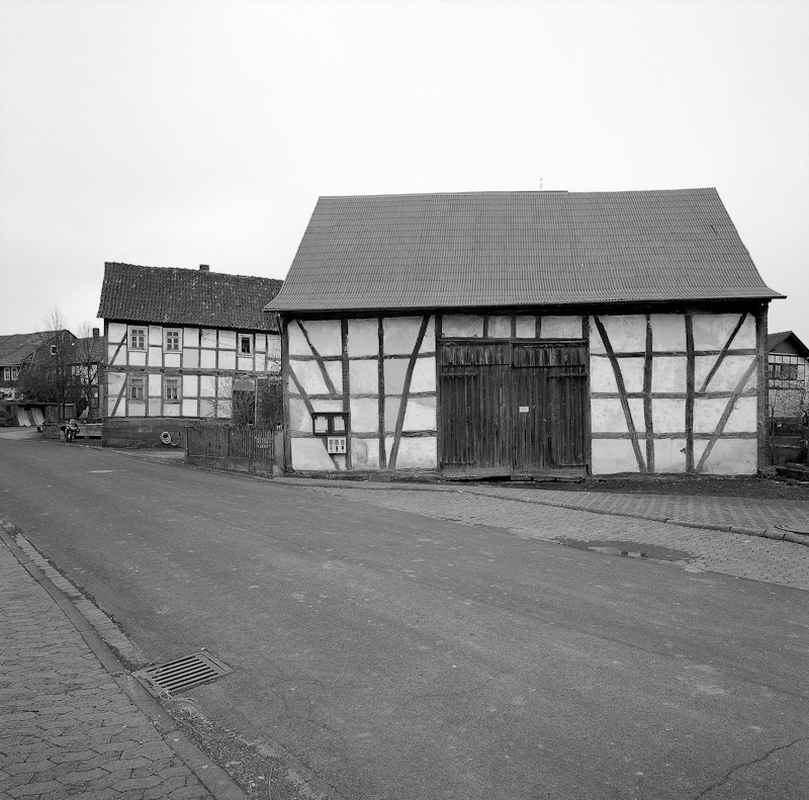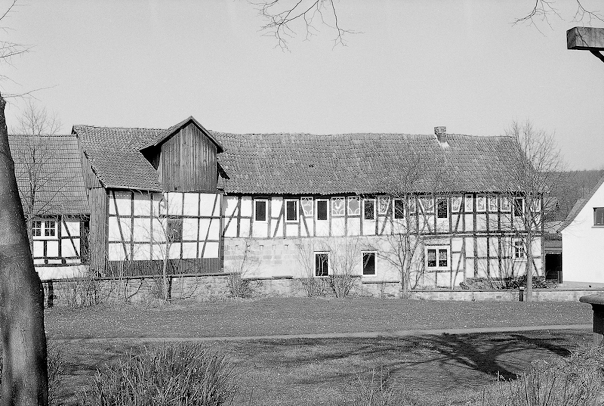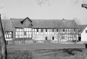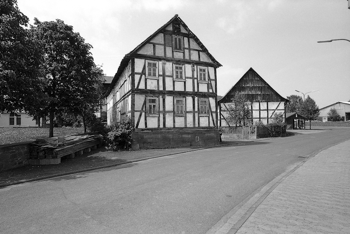 Eindrucksvolle dreiseitig umbaute Hofreite mit Gebäuden aus verschiedenen Bauphasen. Giebelständig das langestreckte zweistöckige Wohnwirtschaftshaus auf mittelhohem bis hohem Quadersockel. Das Fachwerk zeigt eine Konstruktion aus nahezu stockwerkshohen bzw. 3/4 hohen, nach innen geneigten Streben, wie sie typisch für die durch zwei Bauinschriften belegte Entstehungszeit ist. Eine Schwellbalkeninschrift lautet "DIESE HAUS HAT MIT GOTT ERRICHTEN LASSEN NIKOLAUS STAUBACH UND DESSEN EHEFRAU MARIA ANNA DURCH DEN ZIMMERMEISTER JOH. ADAM BOSOLD IM JAHRE MDCCCXXXXIII". Eine weitere Inschrift im Sockel belegt "UNTER GOTTES BEISTAND HAT GEBAUT N. STAUBACH I. I. 1843". Bemerkenswert ist auf der hinteren Längsseite eine größere Anzahl von Gefachen mit Kratzputz, eine für das Kreisgebiet äußerst selten anzutreffende Technik. Dargestellt sind u. a. Blumenmotive, Vögel, aber auch eine Sonne mit einer Art Malteserkreuz darüber. Auf der zum Hof liegenden Eingangsseite sitzt im Obergeschoss zwischen zwei Fenstern ein halber Putzring auf einem Gefach. An die hintere Giebelseite des Baus schließt ein Scheunentrakt aus Fachwerk an, der einen Getreideaufzug im Dach aufweist. Winklig dazu steht ein Wohn- und Stallgebäude in Mischbauweise. Das für Wohn- und Lagerzwecke genutzte und mit Backstein ausgefachte Obergeschoss (ehemalige Gesindewohnung oder Altenteil?) kragt zum Hof hin über den massiven Stallteil vor und wird von Holzstützen unterfangen. Gegenüber dem eigentlichen Wohnhaus steht die noch erhaltene Altscheune, ein imposanter Ständerbau mit symmetrischer Anordnung leicht gebogener Streben und großem Mitteltor, der durchaus noch aus dem späten 17. Jahrhundert stammen könnte. Die Stützstreben sind so angeordnet, dass jeweils zwei übereinander, unten 3/4 hoch und über dem mittleren Querriegel halbhoch, zur Gebäudeecke geneigt sind, während die Scheunentore von je einer bis zur Traufe reichenden und zur Gebäudemitte geneigten Strebe flankiert werden. Die historisch gewachsene Hofreite mit ihrer eindrucksvollen Altscheune und dem jüngeren Wohnhaus mit den seltenen Krattzputzornamenten liegt an markanter Stelle am Eingangsbereich zum alten Kern von Roßbach an der Kreuzung Ulsterstraße und Schwalmstraße.