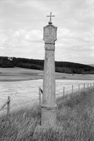 Südlich des Ortes nahe der Landestraße 3176 platzierter Bildstock, der vermutlich um die Mitte des 18. Jahrhunderts geschaffen wurde. Auf dem schlanken Postament befinden sich einfache Zierrahmen mit heute weitgehend nicht mehr lesbaren Inschriften, über denen je ein Engelsköpfchen sitzt. Auf der Rückseite ist die Stifterinschrift "HAT ERRICHTET KASBER BAR BÜRGERMEIST. IOSEPH IORDAN SCHMIEDMEISTER" zu erkennen. Der kräftige, sich nach oben verjüngende Pfosten mit abgefasten Ecken ist mit Rankenwerk in Flachrelief belegt. Er mündet in einem profilierten Kapitell aus Blattwerk. Der Aufsatz mit eingezogenem Segmentbogenabschluss zeigt auf der Vorderseite eine Kreuzigungsdarstellung, auf der Rückseite einen hl. Wendelinus mit Bäumen und liegender Kuh. Auf den Schmalseiten wird der Aufsatz von vasenähnlichen Ornamenten geschmückt. Als Bekrönung des reizvollen barocken Bildstocks fungiert eine Steinkugel mit Eisenkreuz.