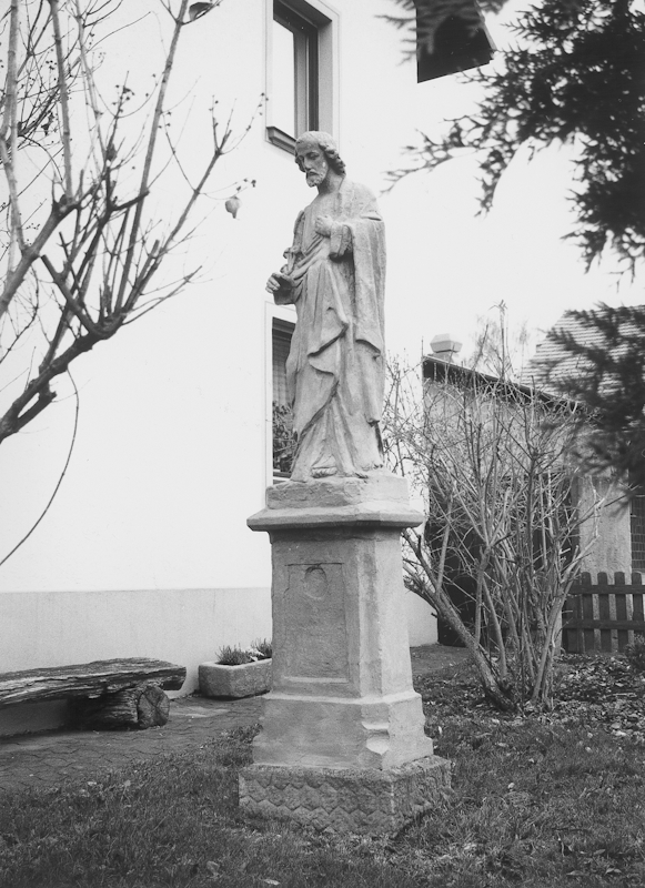 Im Vorgarten des modernen Wohnhauses Am Anger 3 aufgestellte interessante Vollplastik des hl. Josef. Die vermutlich um 1900 gefertigte Skulptur zeigt den hier in seltener Weise ohne Jesusknaben dargestellten Heiligen in nachdenklicher Pose mit leicht geschlossenen Augen und etwas nach vorne geneigtem Haupt. Die Figur steht auf einem hohen abgetreppten Postament mit gekehlten Ecken und schlichten Zierfeldern.