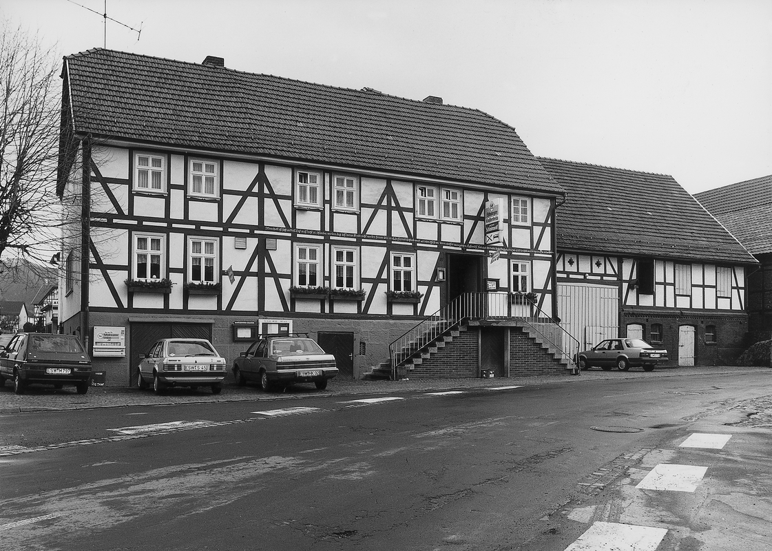 Wohnhaus mit mehreren Wirtschaftsgebäuden aus dem Jahr 1833 über hohem Sockel in zwei Geschossen. Prägendes Motiv der Fachwerkkonstruktion sind die 3/4-Streben mit Brustriegeln an Eck- und Bundständern beider Geschosse. Der Eingang ist über eine zweiläufige Freitreppe erreichbar. Als Beispiel eines großbäuerlichen Anwesens mit straßenzugprägender Lage sind die Gebäude aus sozialgeschichtlichen und städtebaulichen Gründen schützenswert.