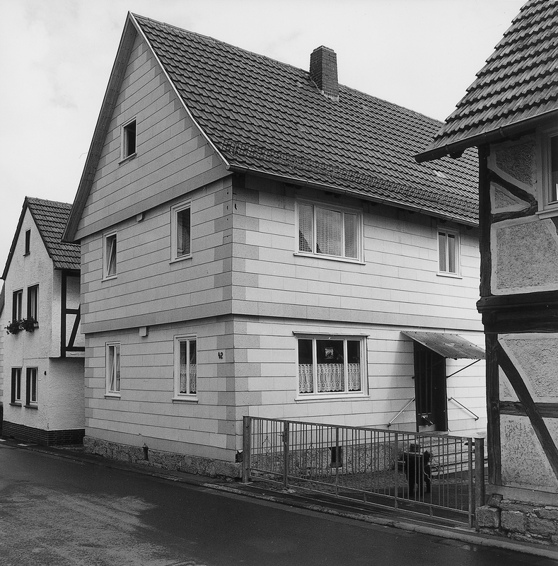 Verplattetes Wohnhaus einer Hofanlage, um 1800 entstanden. Auf Grund des Geschossüberstandes und der Anordnung der Fenster muss ein Fachwerkgefüge unter den Platten angenommen werden.