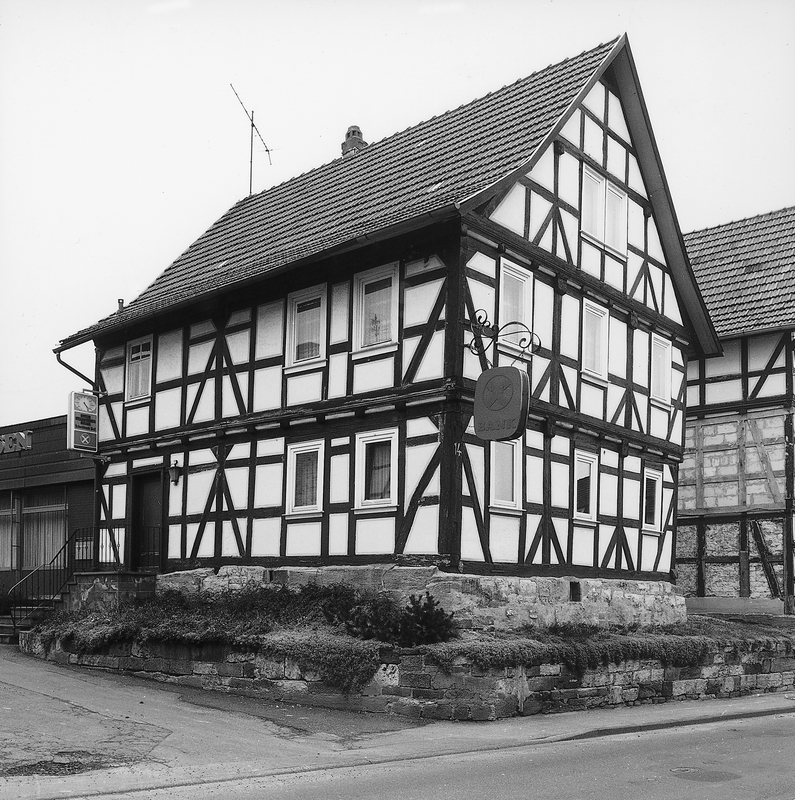 Fachwerkwohnhaus aus dem Ende des 18. Jhs. mit markantem, das Straßenbild prägendem Gerüstraster: an den Eck- und Bundständern beider Geschosse kräftige Mannfiguren mit Hals- und Brustriegeln, an den giebelseitigen Zwischenständern konvergierende Fußstreben im Brüstungsbereich.