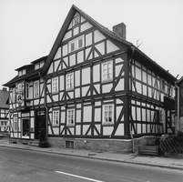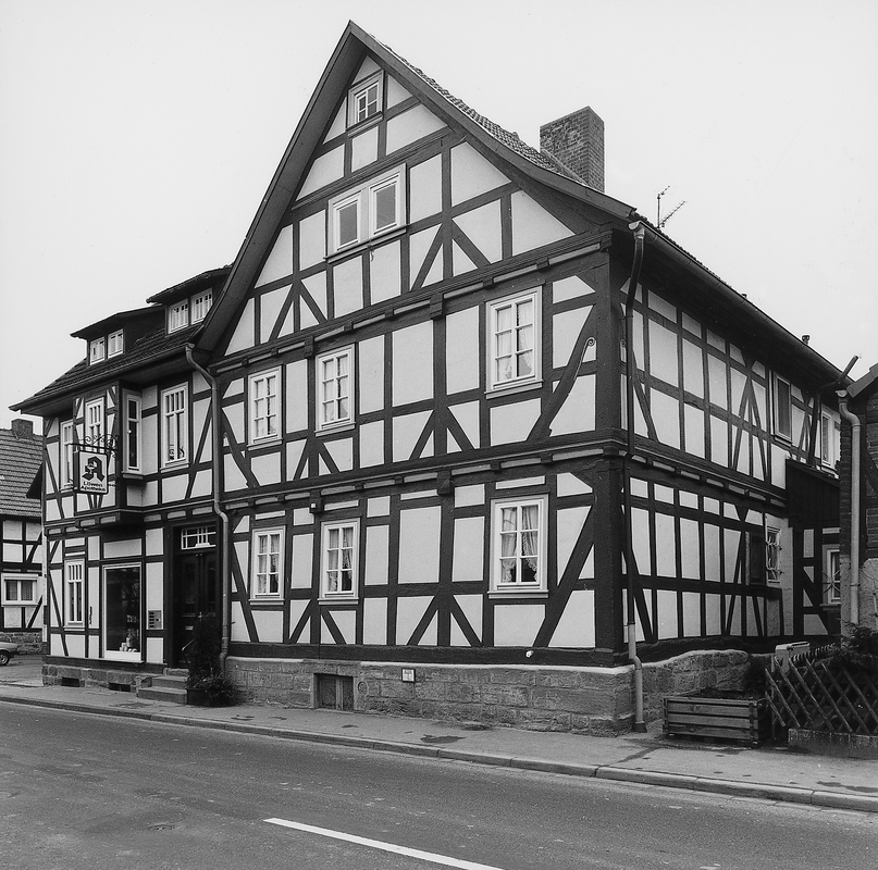 In das Jahr 1770 inschriftlich datiertes Wohnhaus mit repräsentativem, klar gegliedertem Fachwerkgefüge, bestehend aus Mannfiguren an den Eck- und Bundständern sowie konvergierenden Fußstreben an den giebelseitigen Zwischenständern. Links jüngerer Anbau aus dem Jahr 1913. Die seit dem Jahr 1818 in diesem Gebäude befindliche Apotheke ist aus städtebaulichen und ortsgeschichtlichen Gründen erhaltenswert.