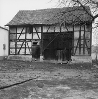 Giebelständiges Wohnhaus in zwei Geschossen über hohem, massivem Sockel in einer klar gegliederten Fachwerkkonfiguration um 1770 mit Mannfiguren an Eck- und Bundständern. Im hinteren Bereich neben der Kirche Scheune in Ständer-Rähm-Mischbauweise aus dem 19. Jh.