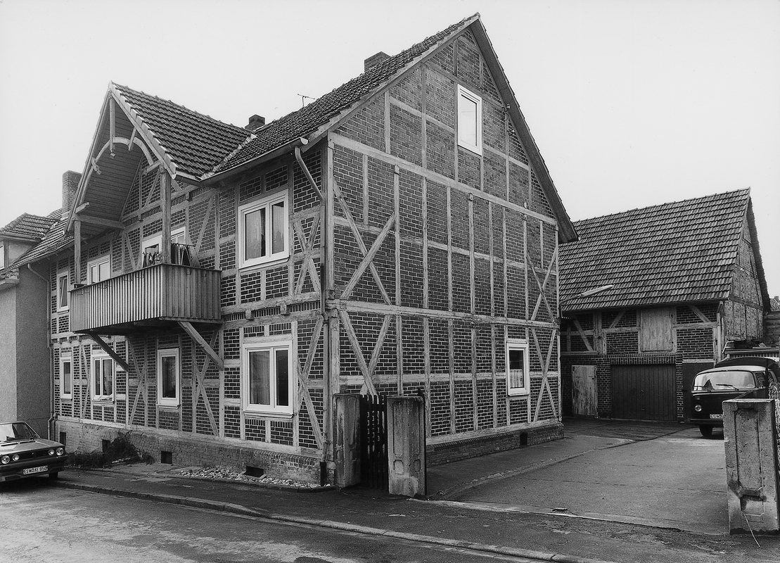 Stattliches traufständiges Wohnhaus aus dem Ende des 19. Jhs. in lebhaftem Fachwerkraster mit hervorgehobenen Andreaskreuzen als kennzeichnendem Merkmal. Im hinteren Teil des Grundstückes erhebt sich ein Wirtschaftsgebäude in ähnlicher Gestaltungsweise.
