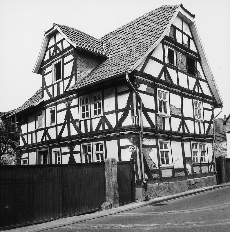 Giebelständiges Wohnhaus eines Streckhofes aus der Mitte des 18. Jhs. in zwei Geschossen mit kräftigen Mannfiguren an den Eckständern, eingelegtem Rundstab und rahmendem Flachschnitzdekor. An der Unterkante der Schwelle geteilte Fase.