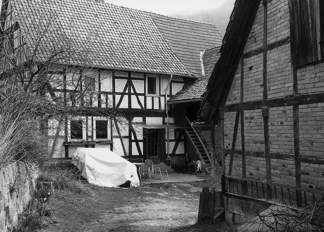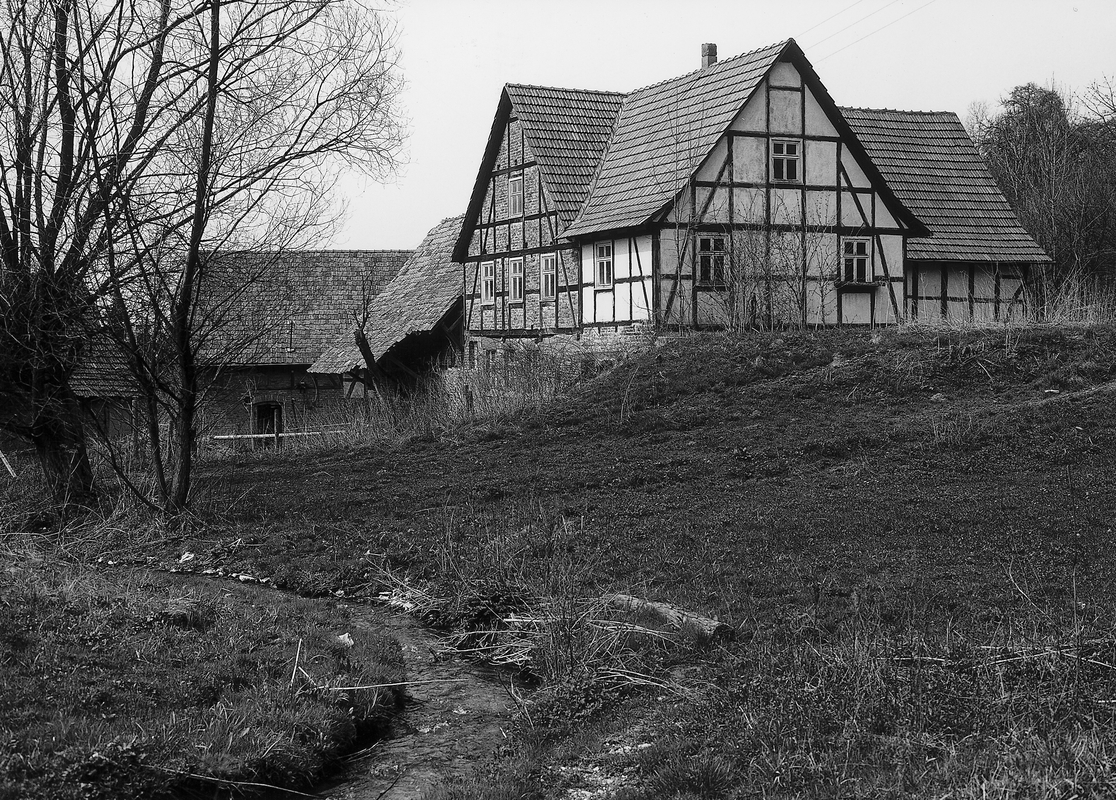 Die dreiseitige Hofanlage besteht aus dem um 1750 erbauten Wohnhaus, einer inschriftlich 1784 datierten Scheune, Wirtschaftsgebäuden sowie einem Backhaus. Das Fachwerk zeichnet sich durch Mannfiguren mit Halsriegeln an den Eckständern und einem Leitermotiv im Brüstungsbereich aus. Schwelle mit Seilbandprofil und abgefaster Unterkante. Die Wirtschaftsgebäude sind über einem Sandsteinsockel in konstruktiver Fachwerkkonfiguration, der Stall mit massivem Erdgeschoss erbaut. Als vollständig erhaltene Mühlenanlage ist der Komplex schützenswert.