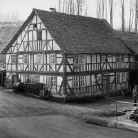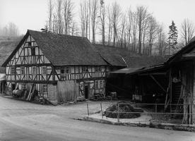Hofanlage mit Wirtschaftsgebäuden, wohl ehemalige Mühle. Das Wohnhaus zeigt einen Fachwerkverband aus der zweiten Hälfte des 18. Jhs.: an den Eckständern Mannfiguren mit Hals- und Brustriegeln, dazwischen an der Traufseite im Brüstungsbereich Leitermotiv.
