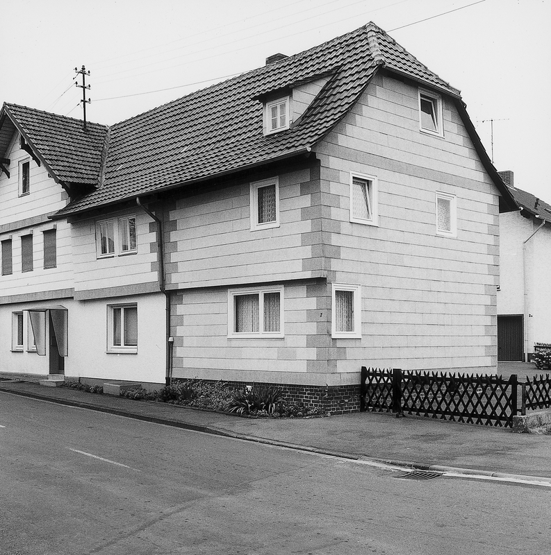 Traufständiges Wohnhaus in zwei Geschossen, vollständig mit Eternitplatten bedeckt. Darunter befindet sich ein Fachwerkverband aus Mannfiguren mit überblatteten Kopf- und Fußstreben an den Eck- und Bundständern des Obergeschosses aus dem Beginn des 17. Jhs.