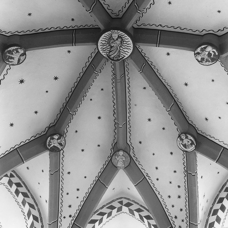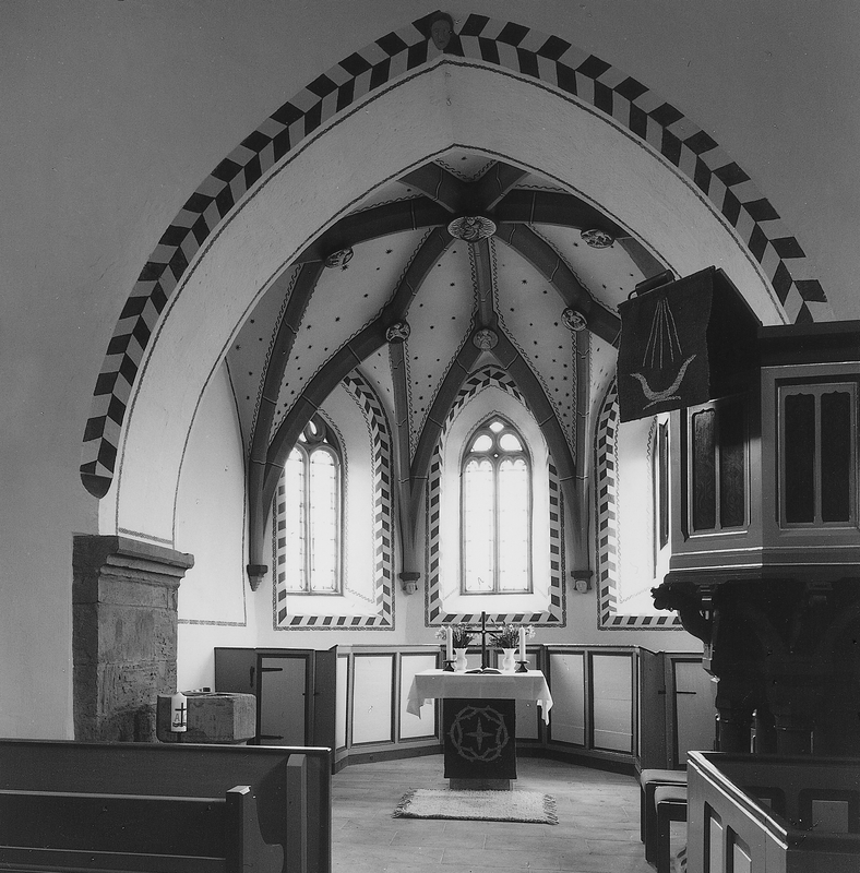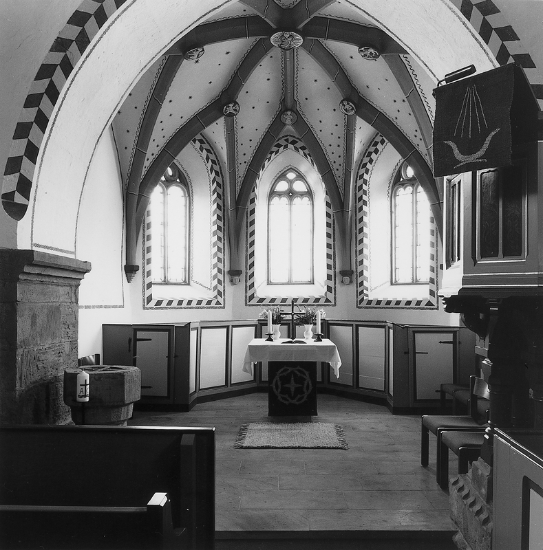 Im Inneren überrascht der Chor mit einem reichen Sterngewölbe und figürlichen Schlusssteinen, die Szenen der Johannesapokalypse thematisieren.