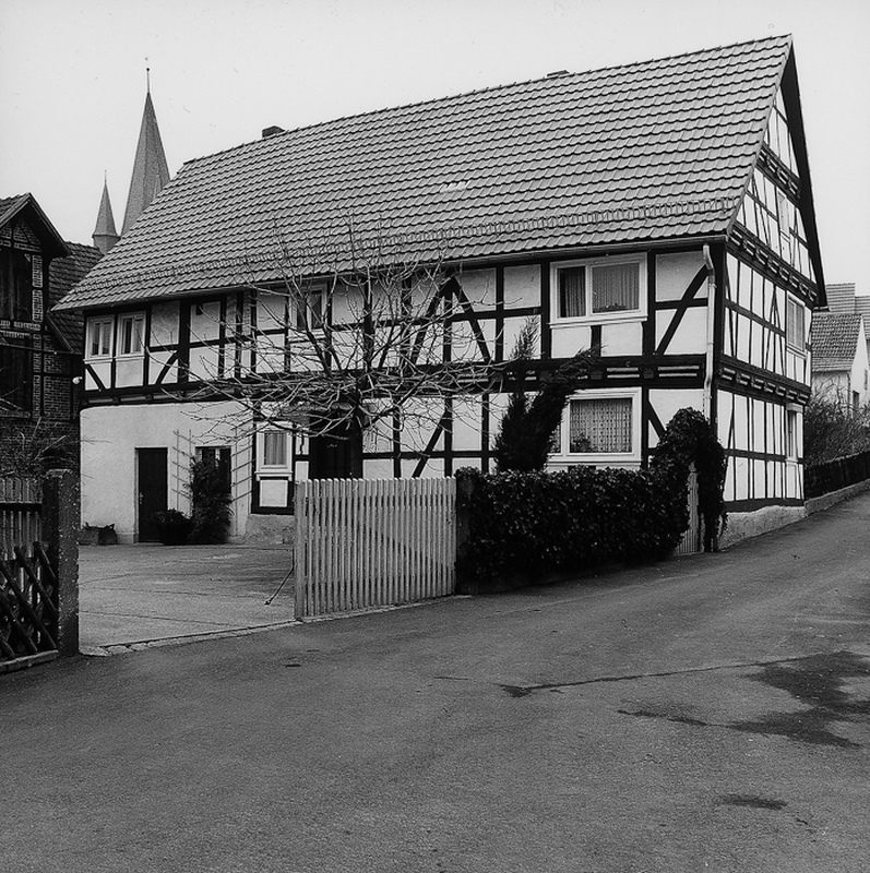Giebelständiges Wohnhaus in zwei Geschossen aus der ersten Hälfte des 17. Jhs. mit rückwärtigem Anbau aus dem 18. Jh. Fachwerkkonfiguration in konstruktivem Gefüge mit 3/4-Streben an den Eck- und Bundständern, an der Unterkante der Schwelle und an den Füllhölzern eingelegte Schiffskehlen mit Rundstab.