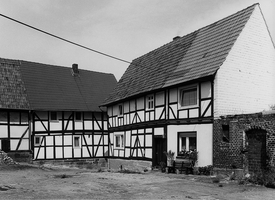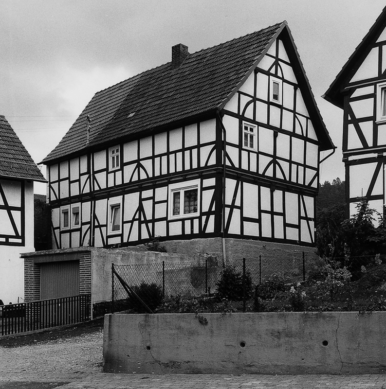 Traufständiges Wohnhaus über hohem Sockel mit markant gebogenen Fußstreben an den Eckständern des Obergeschosses ; dazwischen an der Traufseite Sprossengefüge eines Leitermotives. Der durch den Terrainabfall bedingte Sockel ist ein ortsbildprägendes Motiv dieses Gebäudes aus dem Ende des 18. Jhs.