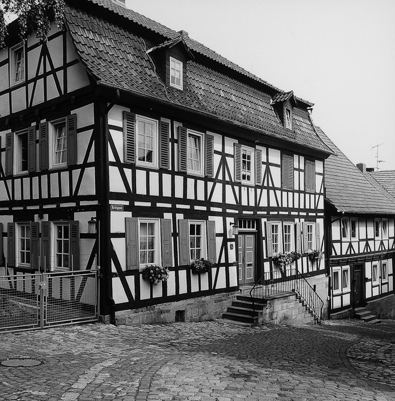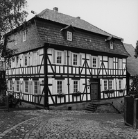 Pfarrhaus in unmittelbarer Nähe zur Kirche aus der zweiten Hälfte des 18. Jhs. Über einem hohen Sockel, der das abfallende Terrain ausgleicht, erhebt sich das zweigeschossige Gebäude in dichtem Fachwerkgefüge: an den Eck- und Bundständern festigen 3/4-Streben mit Hals-und Brustriegeln das Strebengerüst, dazwischen verläuft ein Leitermotiv im Brüstungsbereich. Der Eingang ist über eine zweiläufige Freitreppe erreichbar.