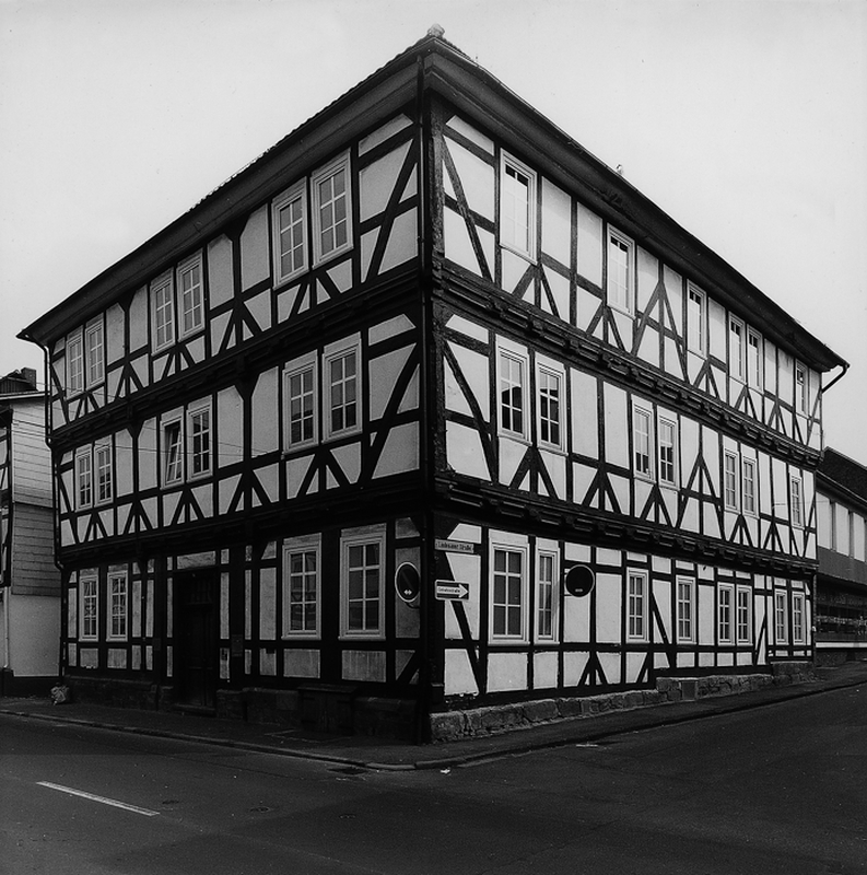 Stattliches Wohnhaus in ortsbildprägender Ecklage aus dem Ende des 17. Jhs. mit dichtem Fachwerkgefüge in drei Geschossen. An den Eckständern befinden sich Mannfiguren mit Hals- und Brustriegeln, an den Zwischenständern konvergierende Fußstreben im Brüstungsbereich und Kopfknaggen. An der Unterkante der Schwelle und an den Füllhölzern eingelegte Schiffskehlen mit Rundstab, Eckständer mit volutenförmigem Flachschnitzdekor und Schuppenmotiv.