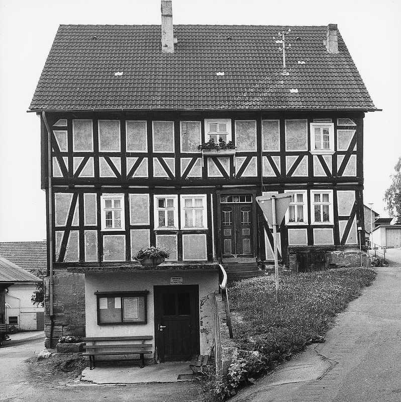 Traufständiges Wohnhaus über hohem Sockel auf abschüssigem Terrain aus dem letzten Drittel des 18. Jhs. Besonders auffallend ist die friesartige Reihung der divergierenden Fußstreben im Brüstungsbereich zwischen den Eckständern, die von Mannfiguren versteift werden.