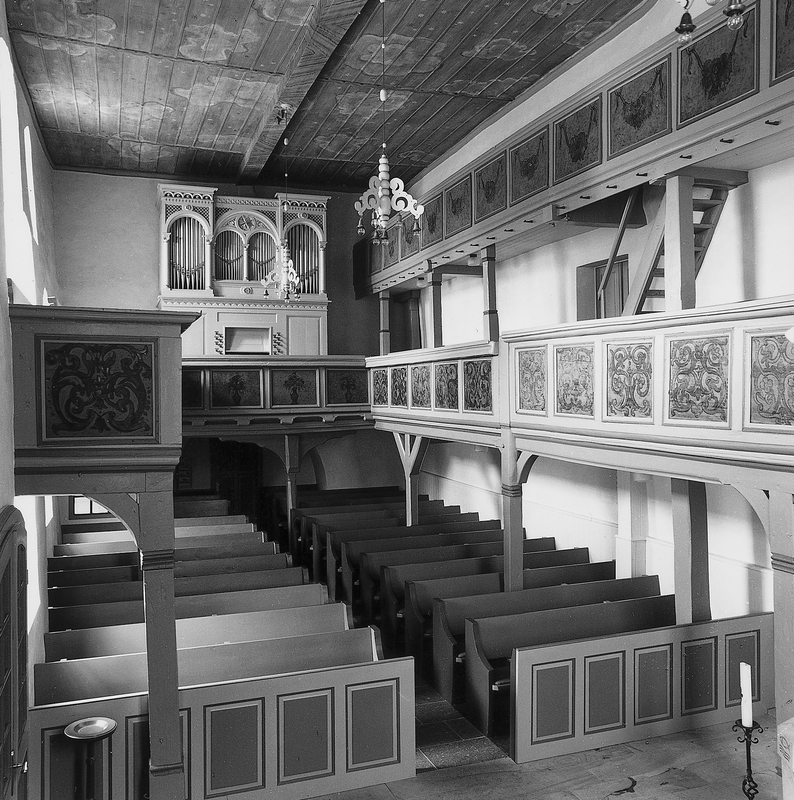 Das Innere erscheint als ein hoher, langgestreckter Kastenraum, der von einem sternenbesetzten Himmel geschlossen wird. Eine horizontale Raumzäsur schafft die umlaufende Empore, die an der Nordwand in zwei Etagen gestaffelt bis knapp unter die Decke reicht.