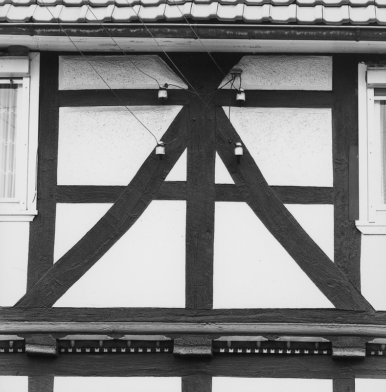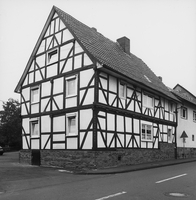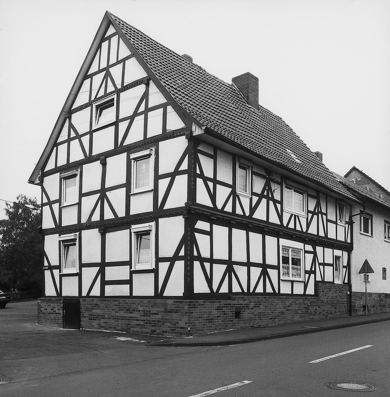 Traufständiges Wohnhaus in Ecklage über einem hohen Sockel aus dem Jahr 1672 mit symmetrischer Fachwerkkonfiguration. An der Traufseite an Eck- und Bundständern Mannfiguren mit weiten Fußstreben. An der Schwellenunterkante geteilt Fase, an den Füllhölzern Eierstabprofil und Zahnschnitt.