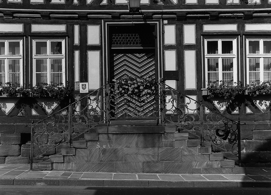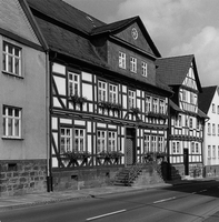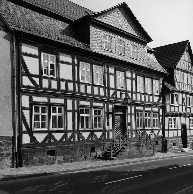 Stattliches Fachwerkwohnhaus über hohem Sockel mit abschließendem Mansarddach und eingefügtem Zwerchhaus in dichtem Fachwerkraster. Gebäudeprägend ist das durchlaufende Leitermotiv im Obergeschoss sowie die konvergierenden Fußstreben des Untergeschosses. Die Datierung des Hauses ins Jahr 1772 befindet sich am schmiedeeisernen Geländer der Eingangstreppe, das aus reichem Rankenwerk mit Girlanden und Füllhörnern besteht. Das repräsentative Gebäude dient heute als städtisches Rathaus.