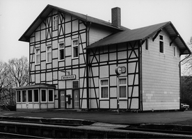 Bahnhofsgebäude aus dem Jahr 1879 mit typischen Fachwerkmotiven aus dem letzten Drittel des 19. Jhs. aus Stockwerkstreben und Andreaskreuzen. Der Typenbau, ähnlich den Bahnhöfen Malsfeld und Oberkaufungen, wurde südlich der Strecke als doppelgeschossiger Giebelbau mit flach geneigtem Satteldach zwischen niedigeren Anbauten in Traufenstellung errichtet. Zu den Gleisen weist ein Stellwerkvorbau, im Westen findet sich ein Güterschuppen an. Die Baugruppe stellt als Relikt der Berlin-Coblenz-Bahn aus verkehrsgeschichtlichen Erwägungen ein Kulturdenkmal dar.