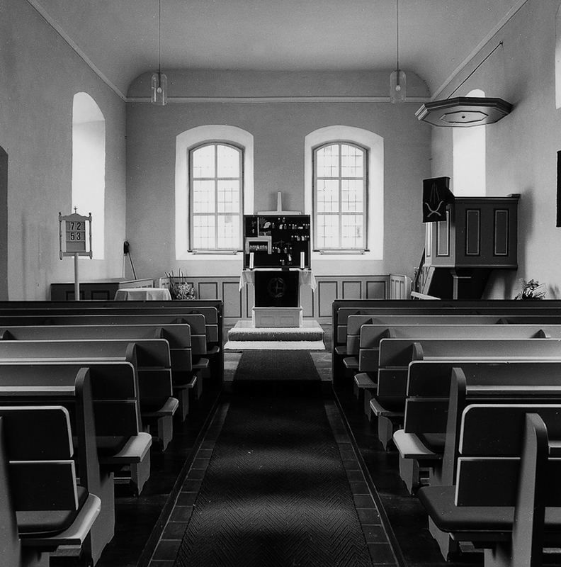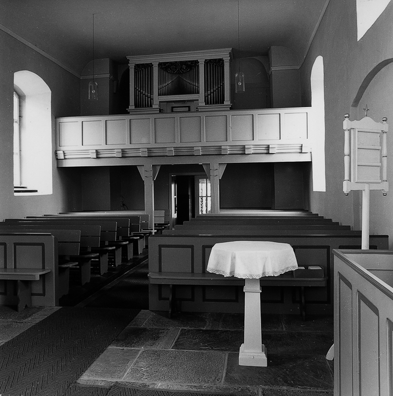 Der Innenraum in schlichter Raumwirkung mit zweigeteilter Empore an den Schmalseiten. Die Belichtung erfolgt durch hohe Rechteckfenster mit Segmentbogenschluss, deren Abfolge von eingeschobenen oculi unterbrochen wird.