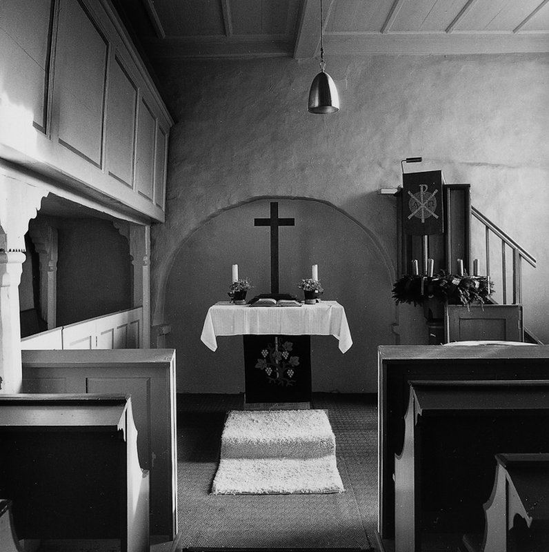 Im Inneren erscheint ein einfacher Saal mit abschließender Flachdecke, deren Unterzug auf starken Holzpfeilern über Knaggen aufsitzt. Bestimmendes Raummotiv ist die Empore, die an der