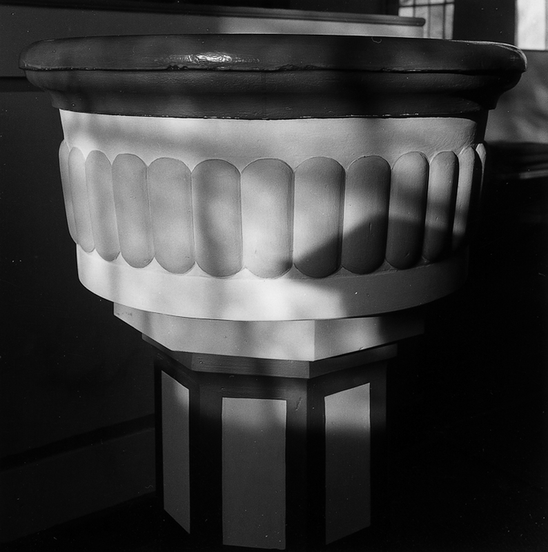 West- und Nordwand entlangläuft. In der Mittelachse des Saales wird die Brüstung der Orgelempore zipfelartig in den Raum gezogen.