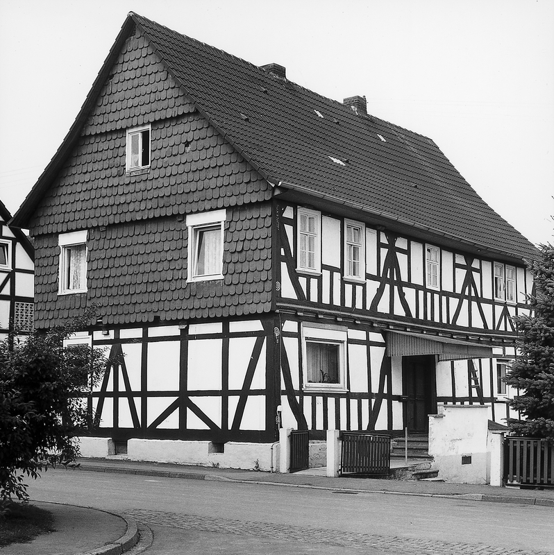 Das ehemalige Schulgebäude des Ortes erhebt sich in zwei Geschossen und zeigt an der traufseitigen Schaufassade ein dichtes Fachwerkgefüge aus der zweiten Hälfte des 18. Jhs. An den Eck- und Bundständern des Obergeschosses verfestigen Mannfiguren das Fachwerkgerüst, den Zwischenraum füllen die Sprossen eines Leitermotives. Ein angeschlossener Stall stammt aus der Erbauungszeit des Wohnhauses.