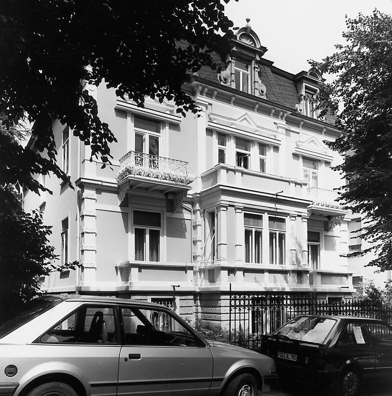 Zweigeschossiges Gebäude mit ausgebautem Dachgeschoß, das Dr. Emanuel Hirsch 1898 errichten ließ; im Erdgeschoß sah man eine Wohnung mit Praxis vor, darüber jeweils eine weitere Wohnung. Die Planung erfolgte durch das aus Frankfurt stammende, in Bad Nauheim mit einer Filiale vertretene Baugeschäft Franz Brofft. Zur Straße wird der Baukörper mit Elementen wie Pilastern, Giebelverdachungen der Fenster und anderem mehr geschmückt, ohne daß eine bestimmte historische Stilrichtung als Vorbild faßbar wird. Es dominiert ein flacher Mittelrisalit mit Altan, das Dach mit drei renaissancistischen Gauben in den vertikalen Achsen. Die Gauben werden seitlich von Voluten gerahmt, als oberer Abschluß jeweils ein halbkreisförmiger Bogen mit füllender Rosette. Der wohlgegliederte Bau in seiner ursprünglichen Form ungestört erhalten.