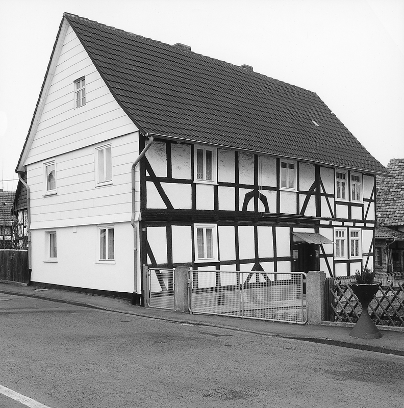 Giebelständiges zweigeschossiges Wohnhaus des 18. Jh. mit einem dem Fachwerk angepassten jüngeren Anbau. Das mit Stipputz versehene Fachwerk hat Dreiviertelverstrebungen und reizvolle Brüstungsstreben, vor allem im Obergeschoss als Viertelkreisstrebe. Die Giebelseite ist mit Eternitplatten behangen. Die Schwelle ist profiliert und mit genasten Schiffskehlen geziert. Hofabgrenzend war ehem. eine traufseitige Scheune mit massivem Erdgeschoss angeordnet. Die gut erhaltene Hofanlage ist Kulturdenkmal aufgrund geschichtlicher und städtebaulicher Bedeutung in der Reihung winkelförmiger Hofanlagen.