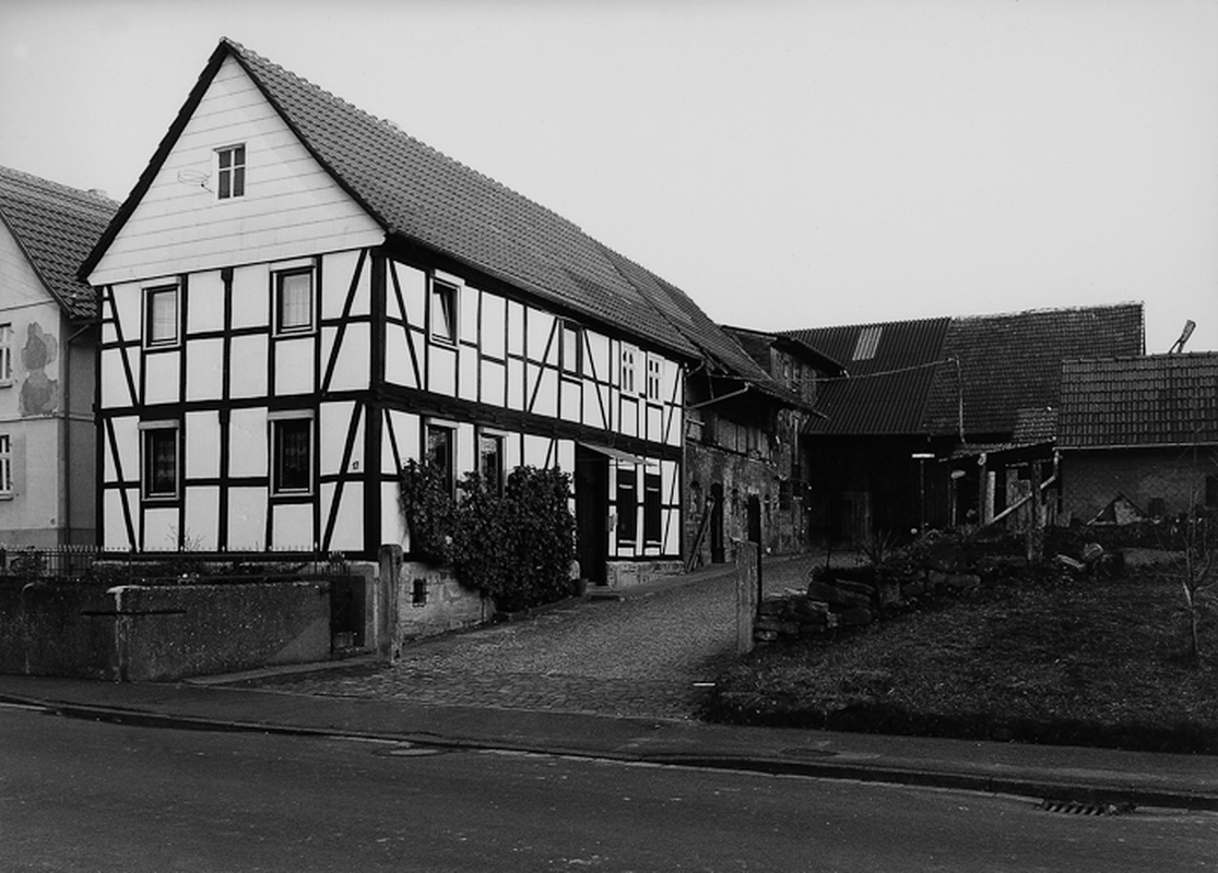 Gut erhaltene Winkelhofanlage mit giebelständigem zweigeschossigen Wohnhaus auf hohem Sandsteinsockel und geschosshohen Verstrebungen aus der Zeit um 1880. Der traufseitige Rähmbau mit geringem Geschossüberstand und genasten Schiffskehlen an der Schwelle hat einen jüngeren Anbau als massives Stall- und Fachwerkobergeschoss und eine traufständige Scheune mit zwei großen Scheunentoren. Bemerkenswerte neuere Hofpflasterung. Die gut erhaltene Hofanlage ist Kulturdenkmal aufgrund geschichtlicher Bedeutung.