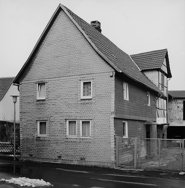 Giebelständiges verkleidetes Fachwerkwohnhaus aus der Zeit um 1800 mit traufständigem Geschossüberstand. Am Anbau - der als Scheune und Stall genutzt wurde - ist ein Zwerchhaus als Ladegiebel angeordnet. Der Anbau ist in einfachem konstruktivem Fachwerk erbaut. Der Schwellenkranz ist mit genasten Schiffskehlen geziert. Anstelle der ehemaligen traufständigen Scheune ist ein störender massiver Anbau. Dem Wohnhaus gegenüber steht ein traufständiges Backhaus mit sandsteinmassiver Eckausbildung und konstruktivem Fachwerk aus der Zeit um 1800. Das Wohnhaus ist nach Freilegung des Fachwerkes zu beurteilen. Wohnhaus und Backhaus sind Kulturdenkmal aufgrund geschichtlicher und städtebaulicher Bedeutung.