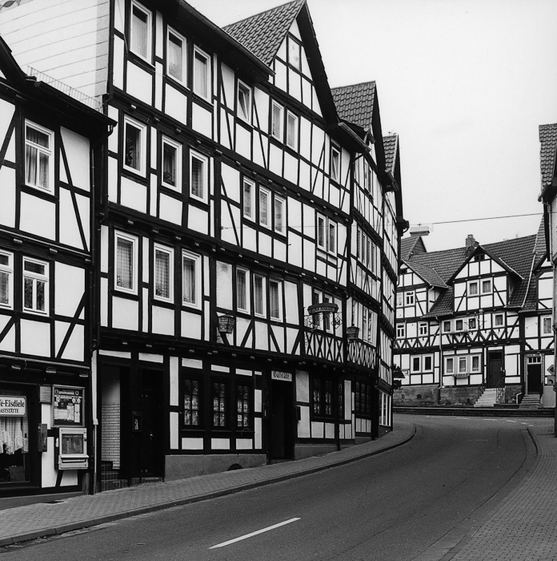 Viergeschossiges Fachwerkgebäude aus dem 19. Jh. in typisch schlichtem Gerüstraster, das durch aufgelegte Andreaskreuze historisiert wird. Das großzügig dimensionierte Haus setzt durch seine Ausdehnung einen städtebaulichen Akzent und ist daher als Kulturdenkmal anzusprechen.
