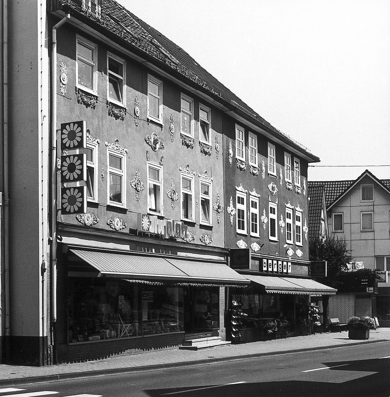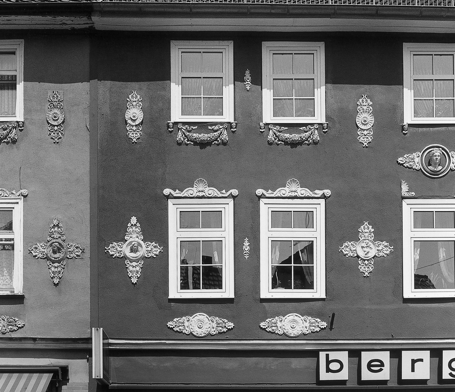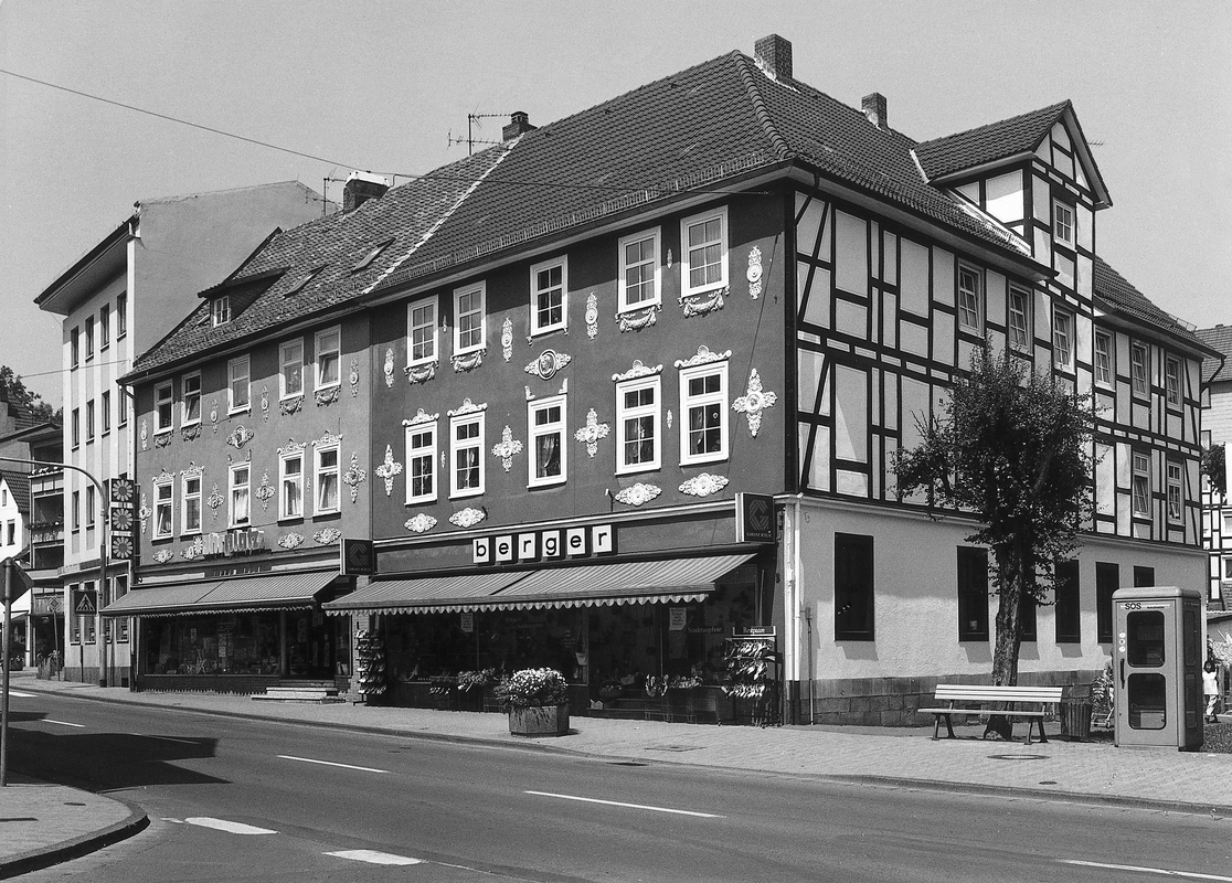 Markantes, dreigeschossiges Wohn- und Geschäftshaus über einer Ecksituation mit einer klassizistischen Putzfassade an der Giebelseite, die in fünf Achsen erschlossen wird. Zwischen und unter den Fenstern befinden sich verzierte Medaillons mit eingelegten Büsten, Girlanden und Fruchtgehänge. An der Traufseite ist das konstruktive Fachwerkgefüge einsichtig. Das Haus mit seiner erhaltenen Putzfassade ist aus architekturgeschichtlichen und städtebaulichen Aspekten schützenswert.