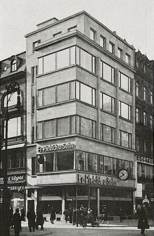 Das traditionsreiche Frankfurter Uhren- und Schmuck-Fachgeschäft „Fr. Pletzsch & Sohn“ wurde 1897 gegründet. Zunächst hatte der schnell expandierende Juwelierladen seinen Sitz in der Fahrgasse (Altstadt), 1914 zog dieser dann an den jetzigen Standort an der Zeil / Ecke Hasengasse. 1927-1928 wurde hier auf einem schmalen Grundstück ein repräsentatives Geschäftshaus als Stahlbeton-Skelettkonstruktion im Stil des Neuen Bauens errichtet, das sich mit seinen großen Fensterbändern und dem leicht zurückversetzten Schaufenster im Erdgeschoss markant von den historistischen Häuserfassaden an der Zeil abhob (Archtitekt Martin Kühn). Nachdem das Geschäftshaus den Zweiten Weltkrieg weitgehend unbeschadet überstanden hatte fiel es 1955 einer Verbreiterung der Zeil zum Opfer.