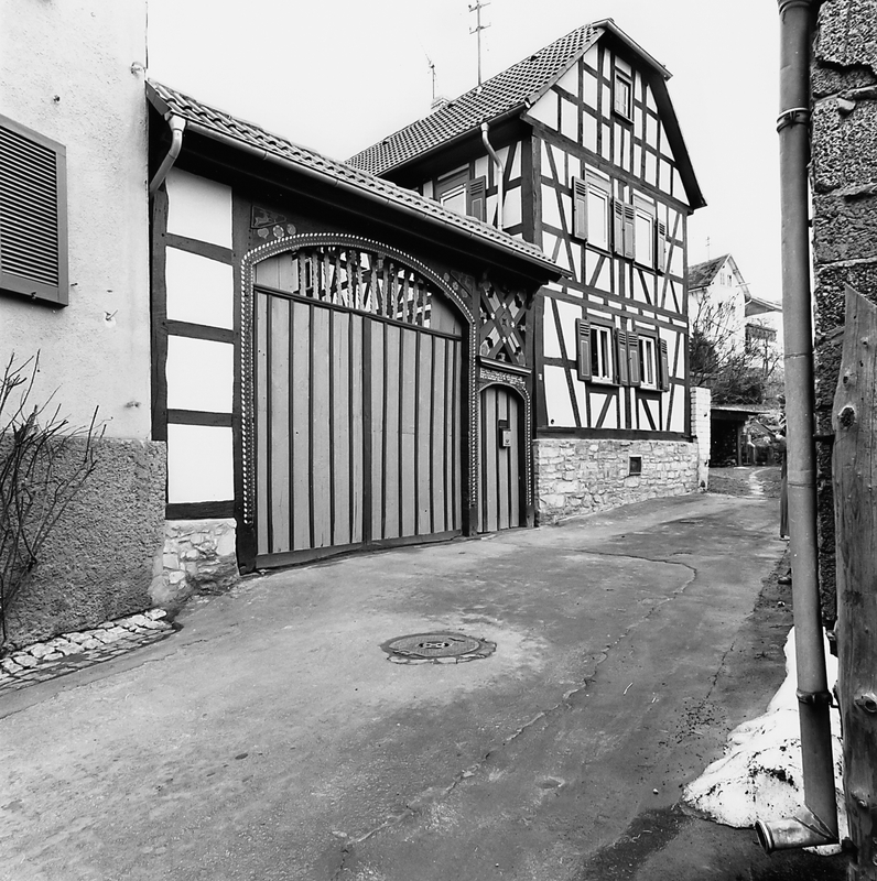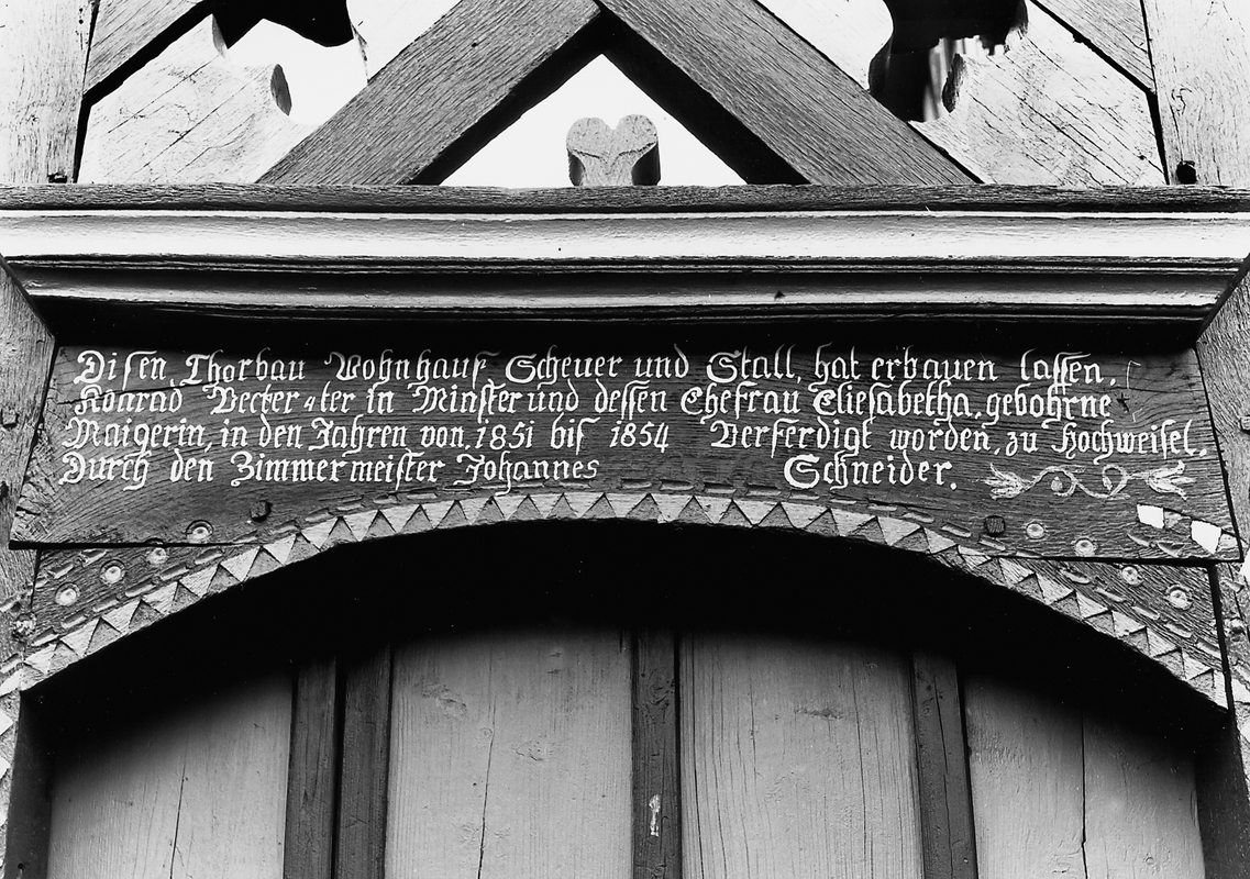 Bemerkenswert einheitliche, winkelförmige Hofanlage am Fuß des Schloßberges von Münster; von der Straße aus ist das zweigeschossige, giebelständige Fachwerkwohngebäude und das seitlich angrenzende überdachte Hoftor sichtbar. Die Inschrift im Sturz der Mannpforte erzählt die Geschichte des Hofes: DIESEN THORBAU WOHNHAUS SCHEUER UND STALL HAT ERBAUEN LASSEN/KONRAD BECKER DER IN MINSTER UND DESSEN EHEFRAU ELISABETHA GEBOHRENE/MAIGERIN IN DEN JAHREN VON 1851 BIS 1854 VERFERDIGT WORDEN ZU HOCHWEISEL/DURCH DEN ZIMMER MEISTER JOHANNES SCHNEIDER.