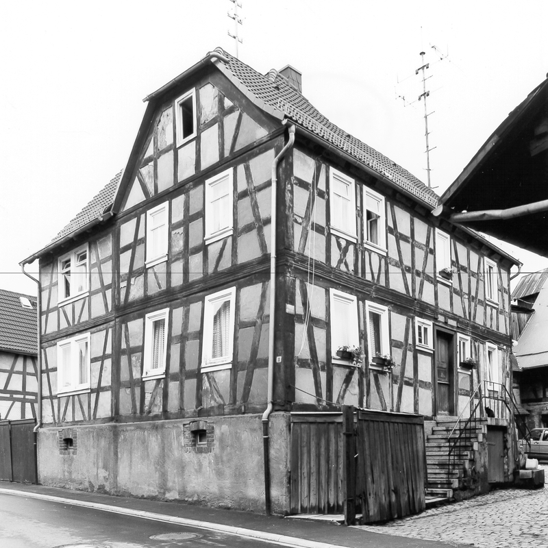 Fachwerkhof des 18. Jhs. Das Wohnhaus mit starker, ortsbildprägender Wirkung innerhalb des Straßenbildes. Gutes, geometrisierendes Fachwerk mit durchgehend verschalter Balkenlage. Im Obergeschoß herzförmige Aussparung in der Brüstung sowie Feuerbock. Abgewalmter Giebel. Späterer Anbau in gleichen Proportionen. Inschrift unleserlich, "1804, ZIMMERMANN AUS MICHELNAU". Die Rückwand massiv in Klinker. Kulturdenkmal wegen seiner baukünstlerischen und städtebaulichen Bedeutung.