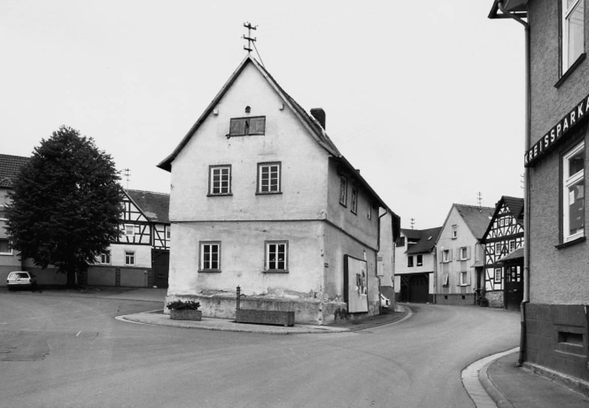 Zweigeschossiges, verputztes Fachwerkgebäude, in der Ortsmitte am Zusammentreffen von Taunus- und Hauptstraße gelegen. Vor der südlichen Traufseite - hier befindet sich der Eingang - eine platzartige Erweiterung der Hauptstraße mit Linde. Das im 18. oder vielleicht sogar noch im 17. Jh. errichtete Gebäude vereinigte die Nutzungen Backhaus und Rathaus. Der Backofen wurde im westlichen Gebäudeteil eingerichtet und ist noch in Gebrauch. Die Rathausnutzung wurde mit dem Bau eines neuen Dorfgemeinschaftshauses 1963 nach dort verlegt.