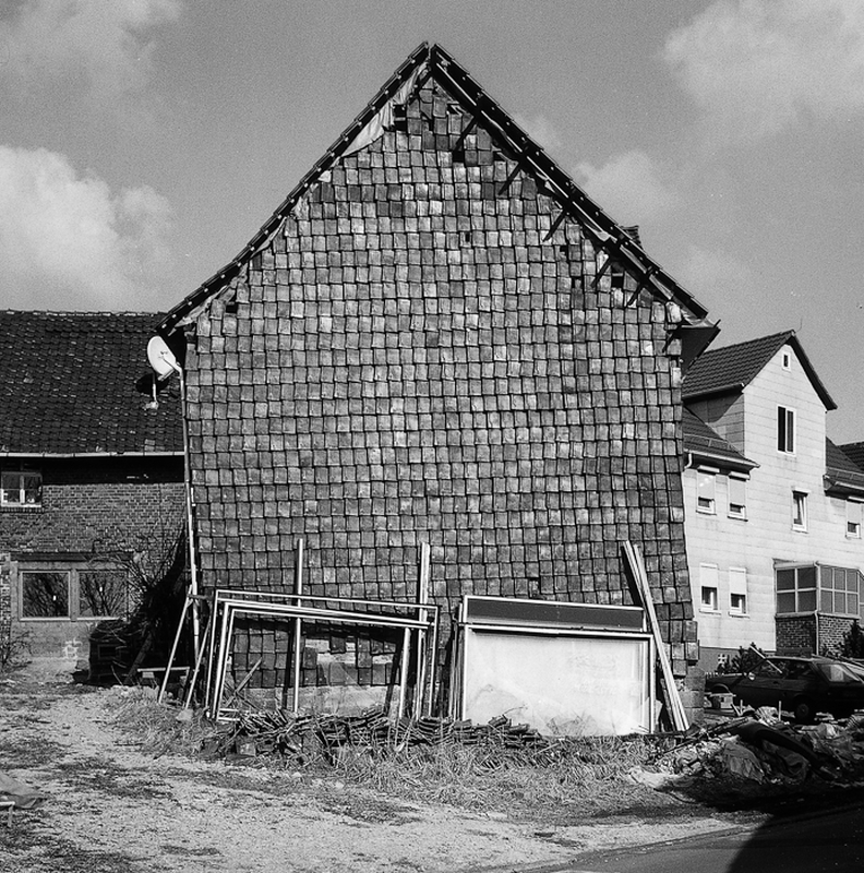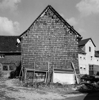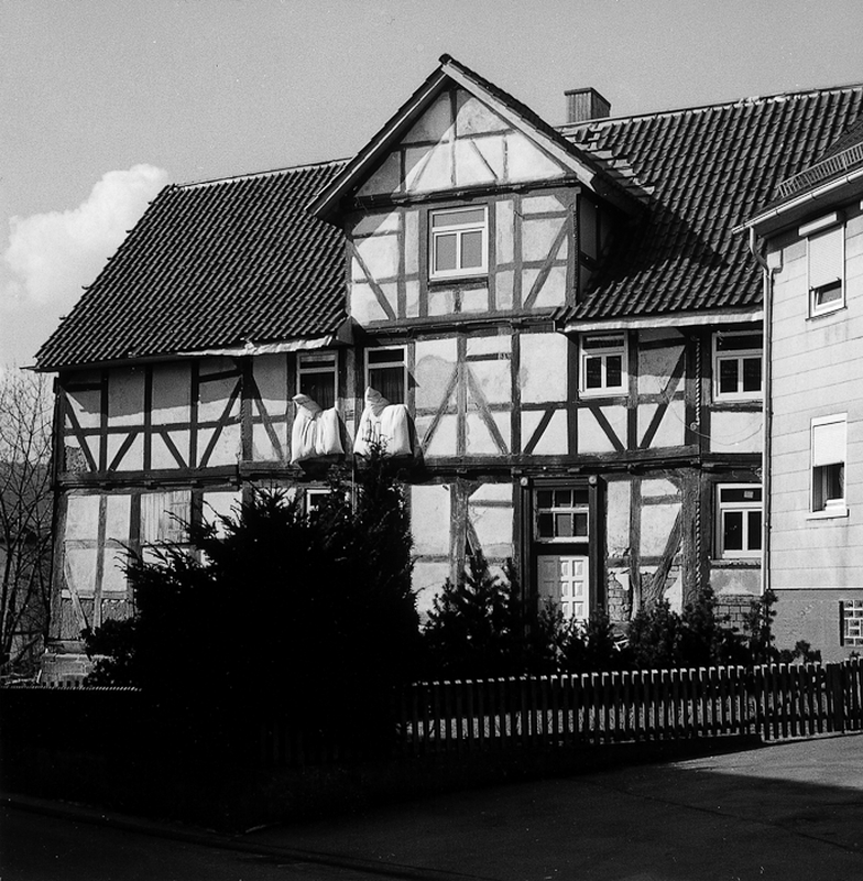 Spitzwinklig zur Straße orientiertes Fachwerkgebäude, das hier den Rand der historischen Ortslage im Westen verdeutlicht. Es handelt sich um einen Streckhof mit einem baulichen Kern aus dem frühen 18. Jh. und jüngeren Zutaten, die das Hauszentrum flankieren. Das Haus ist zweigeschossig über einer hohen Sockelzone entwickelt; rechts ist der Wohnbereich mit eingestelltem Zwerchhaus und einem jüngeren Anbau angesiedelt, linkszonig erhebt sich der Wirtschaftstrakt. Das Fachwerkgerüst mit den Mannfiguren und 3/4-Streben weist auf eine bewegte Baugeschichte. Die Eckständer sind mit dicken Taustäben, deren Enden in Voluten auslaufen, versehen. Die Giebelseite des Hauses ist mit einem Behang aus Großalmeröder Ziegeln versehen.