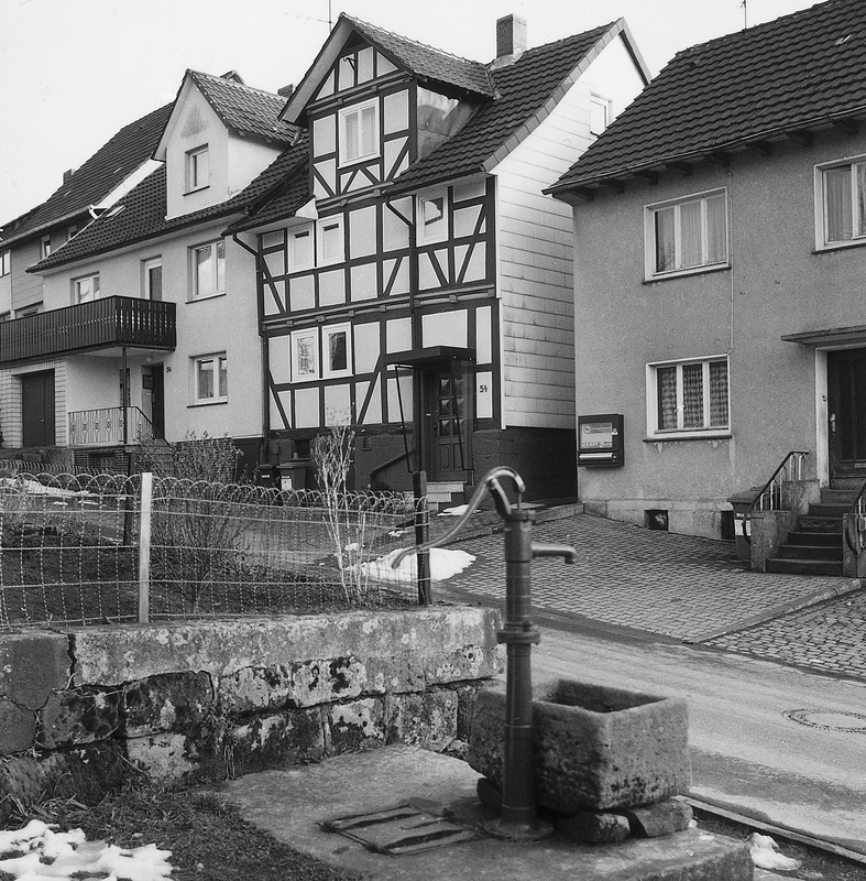 Kleinformatiges Fachwerkwohnhaus in zwei Geschossen und aufgesetztem Zwerchhaus im Oberdorf in unmittelbarer Nachbarschaft zur Kirche, um 1800 erbaut: Die Fachwerkkonfiguration besteht aus doppelt verriegelten 3/4-Streben im Obergeschoss mit sporadisch eingelegten Fußstreben.