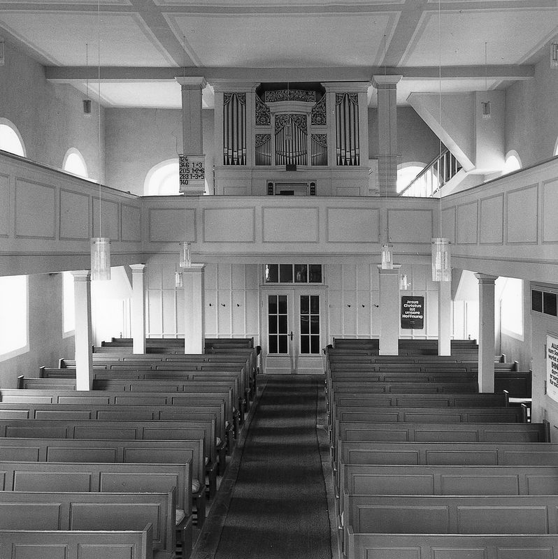und ist in ihrem schlichten Inneren, ein schmuckloser Saal mit Flachdecke und umlaufender Empore, ein typisch protestantischer Kirchenbau des frühen 19. Jhs. Das Äußere des Baukubus mit dem Fassadenturm wird von hohen Fenstern mit Rundbogenschluss gestaltet.