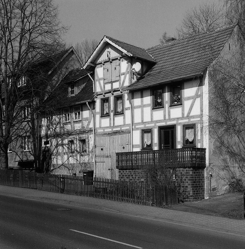 Traufständig erschlossenes Fachwerkwohnhaus mit einem Kern, der aus dem frühen 18. Jh. stammt. Möglich ist die Datierung durch die kräftigen Hölzer, die mittels 3/4-Streben das Fachwerkgerüst versteifen. Rechts angeschlossen ist ein jüngerer Wirtschaftstrakt aus dem 19. Jh. mit einer hohen Tordurchfahrt und darüber befindlicher Ladeluke sowie eine zu Wohnzwecken umgestaltete Scheune. Als eine der auffälligsten Baulichkeiten im Verlauf des Straßenzuges Kulturdenkmal.